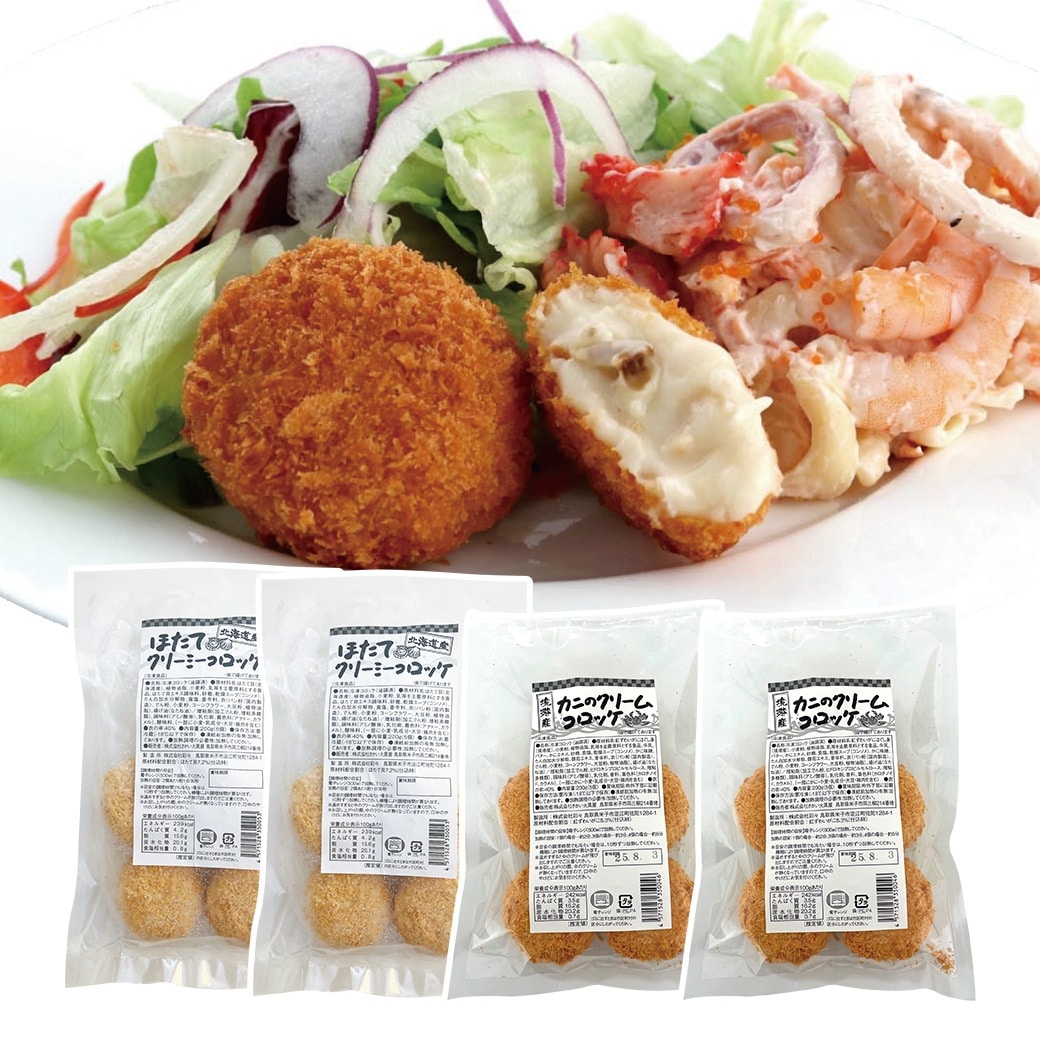 レンジで加熱するだけの簡単調理のとろけるクリームコロッケです。鳥取県産紅ズワイガニ使用のカニクリームコロッケと、北海道産ほたて使用のクリーミーコロッケのセットです。