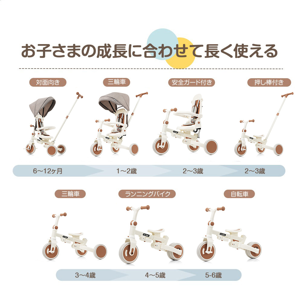 POINT 1.【お子様の成長に合わせて長く楽しめる】 ①対面向き:6~12ヶ月 対面式で親子のコミュニケーションがアップできるし、赤ちゃんに十分な安心感も与えられます。 ②三輪車(押し棒&背もたれ&ベルト付き):1~2歳 子供が自由に歩ける前通常の三輪車としてお使いいただけます。 スデップに足を置けるので、ペダルに足が届かなくても大丈夫。 ③安全ガード付き三輪車:2~3歳 三輪車に慣れる前に360°お子様を落下から守れます。④押し棒付き三輪車:2~3歳 保護者の方が進行方向を決めて動かすことができす。公園や近所のお散歩時などに使用します。 ⑤三輪車:3~4歳 かじとり押し棒を外して、通常の三輪車としてお使いいただけます。 ⑥ランニングバイク:4~5歳 バランスやコントロールを身につけられ、自転車に乗るための練習用として最高です。 ⑦自転車:5-6歳 ペダルを前輪につけてこぎながらバランスをとる練習ができます。POINT 2.【簡単に折りたためる】 折りたたむとコンパクトになるので、ご家庭の保管も場所を取らず、車にもらくらくと積み込めます。車にもらくらくと積み込めます。POINT 3.【機能満載】 ①舵取り押し棒:舵取り機能付きで、手押し棒とハンドルの動きが連動でき、ハンドル操作がうまくできないお子さんでも乗る練習ができます。 ②ペダルの巻き込み防止:押し棒を使う際はペダルを空回りにしておけば足を挟んでしまうことを防げます。 ③角度調整可能な背もたれ:両側のボタンを押すと、背もたれの角度が調整可能です。 ④3段階調節可能なかじとり押し棒:心地よい素材を採用し、操作をもっとやすくなります。 ⑤後輪ストッパー:坂道やお子さまが誤って動かそうとしても車体は動かないので安心です。 ⑥便利な収納バッグ:出かける時は、おもちゃ、カップなどの小物もたっぶり入れます。 ご注意:収納バッグの耐荷重は2kgでございます。 ⑦シートベルト・安全ガード:走行時の揺れによりずり落ちるなどの事故からお子様を守ります。⑧成長に合わせて調整できるベルト:お子さまが成長に合わせて高さを3段階調節できます。POINT 4.【細部にもこだわり】5段階調整可能なハンドル、折りたため・取り外し可能なサンシェード、安全性と実用性が両立する後輪部分の設計、発泡EVA(空気入れ必要なし)【ご注意】①※製造上、画像のような白くなる場合又は波形のような模様が入ります。不良ではないので、返品・交換は出来かねます。ご了承とご理解の上ご購入くださいませ。②サイズ:※曲線部や個体差がありますので、表記と多少の差異が生じることがあります。あらかじめご了承ください。