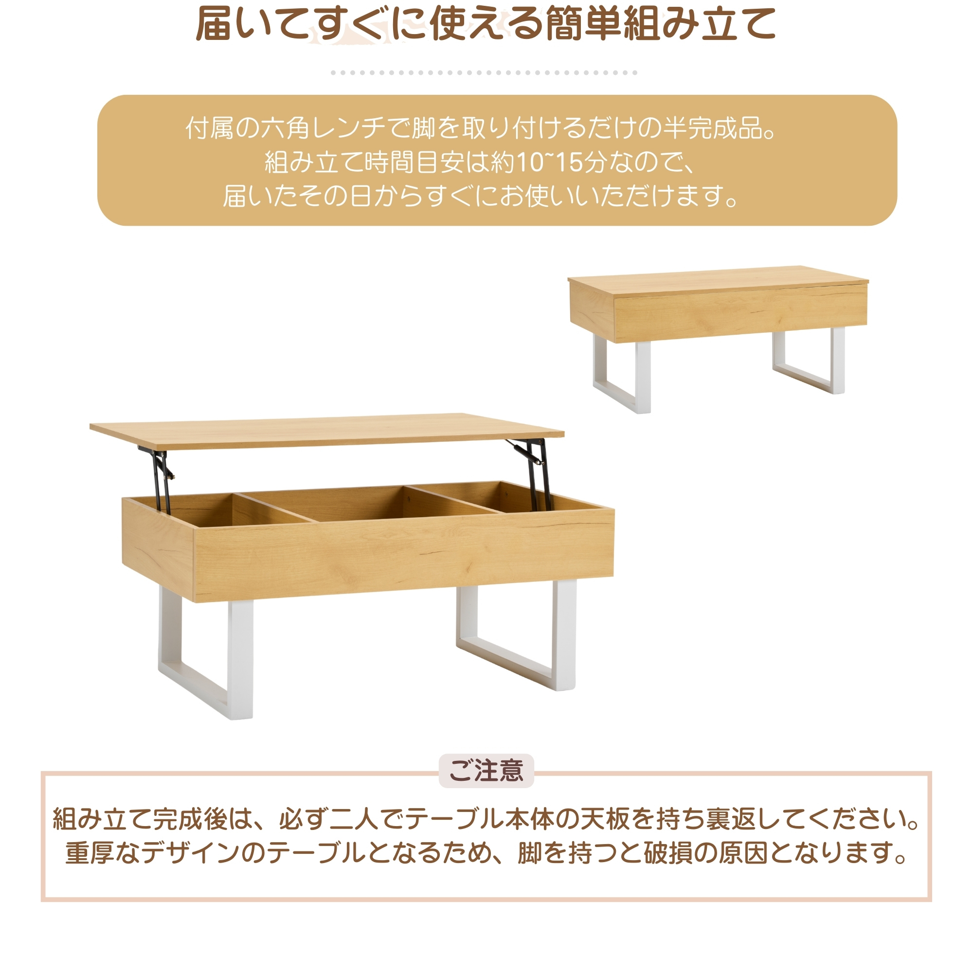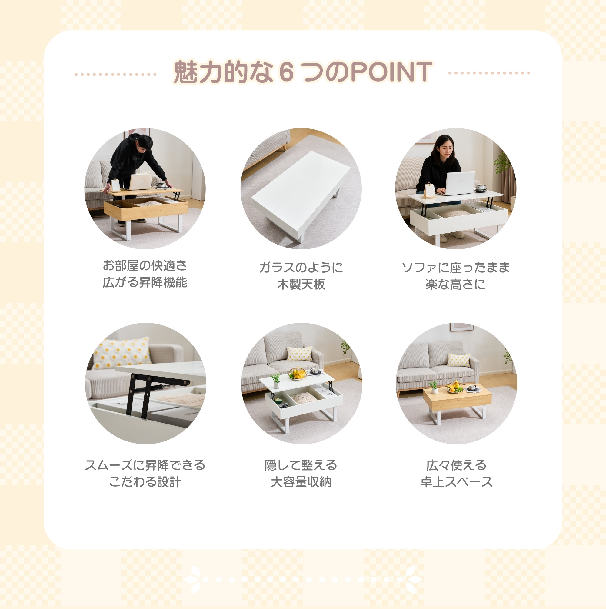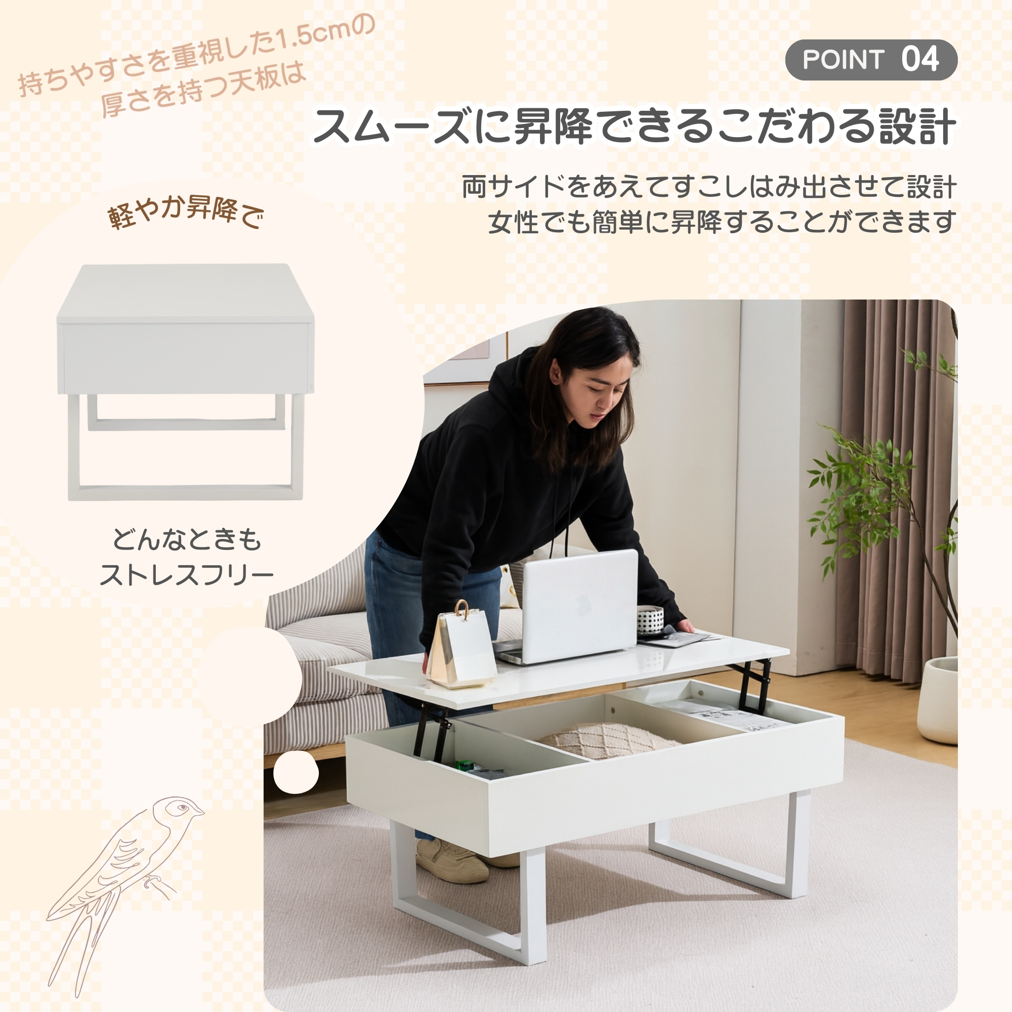 【選べる天板仕上げで、空間の印象が変わる】ブラック・ホワイトは光沢塗装仕上げで、光を映す上品な存在感。ナチュラルは木目を活かしたマット仕上げで、落ち着いた温もりのある印象に。お部屋のテイストや使うシーンに合わせて選べます【69×53cm、作業も食事も余裕のワークスペース】幅69×奥行53cmの天板は、ノートPCを広げても余裕のサイズ感。食事、PC作業、ミシン、趣味の作業台まで、1台で幅広く対応します【使わない時は隠せる、大容量の天板下収納】幅56×奥行41cmの収納スペース付き。ノートPCやリモコン、雑誌などをまとめて収納でき、テーブル周りをすっきり保てます【静かでスムーズな油圧リフト構造】金属製の油圧リフティングロッドを採用。開閉はスムーズで静か、毎日の使用でもストレスを感じません【高さ調節で、暮らしに合わせて使える】ローテーブルとしてくつろぎ時間に。作業テーブルとして仕事や趣味に。生活シーンに合わせて柔軟に使える高さ調節設計です