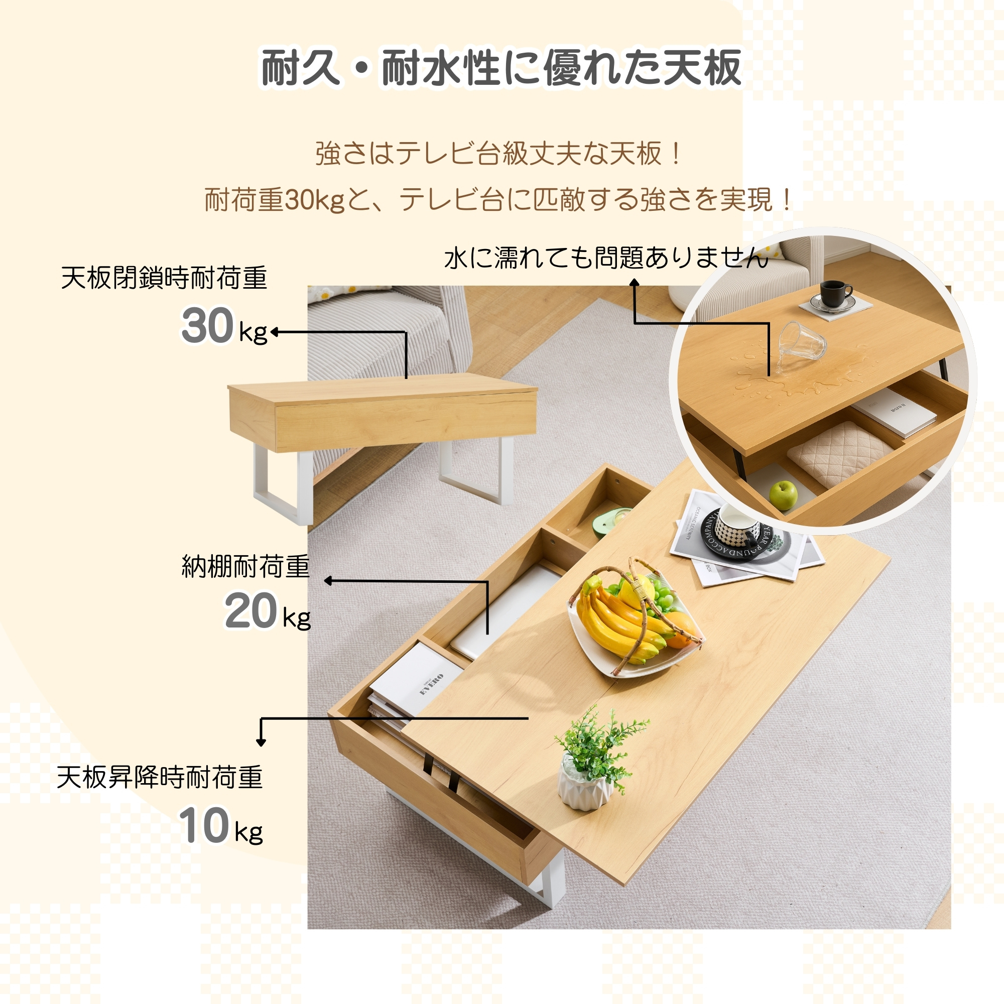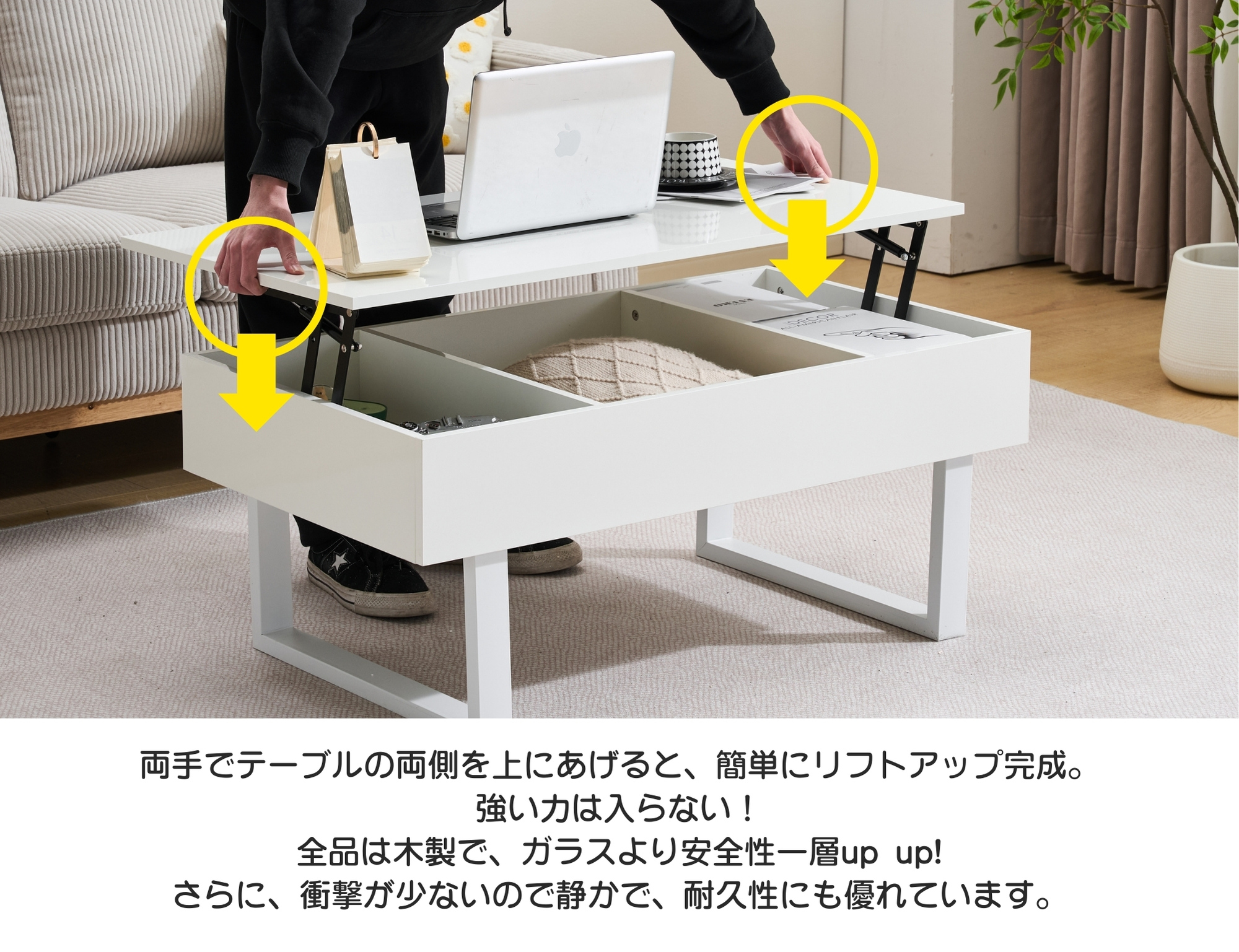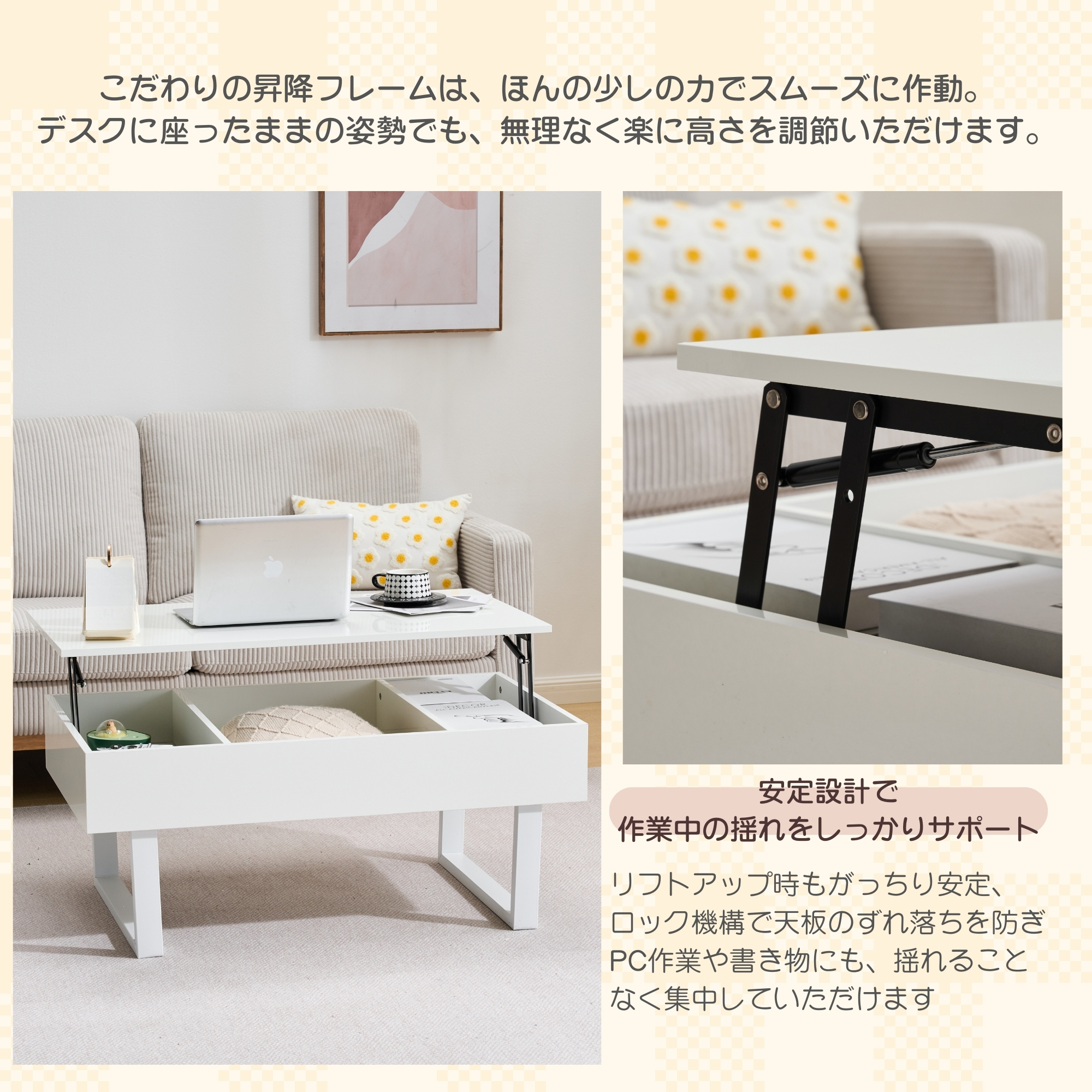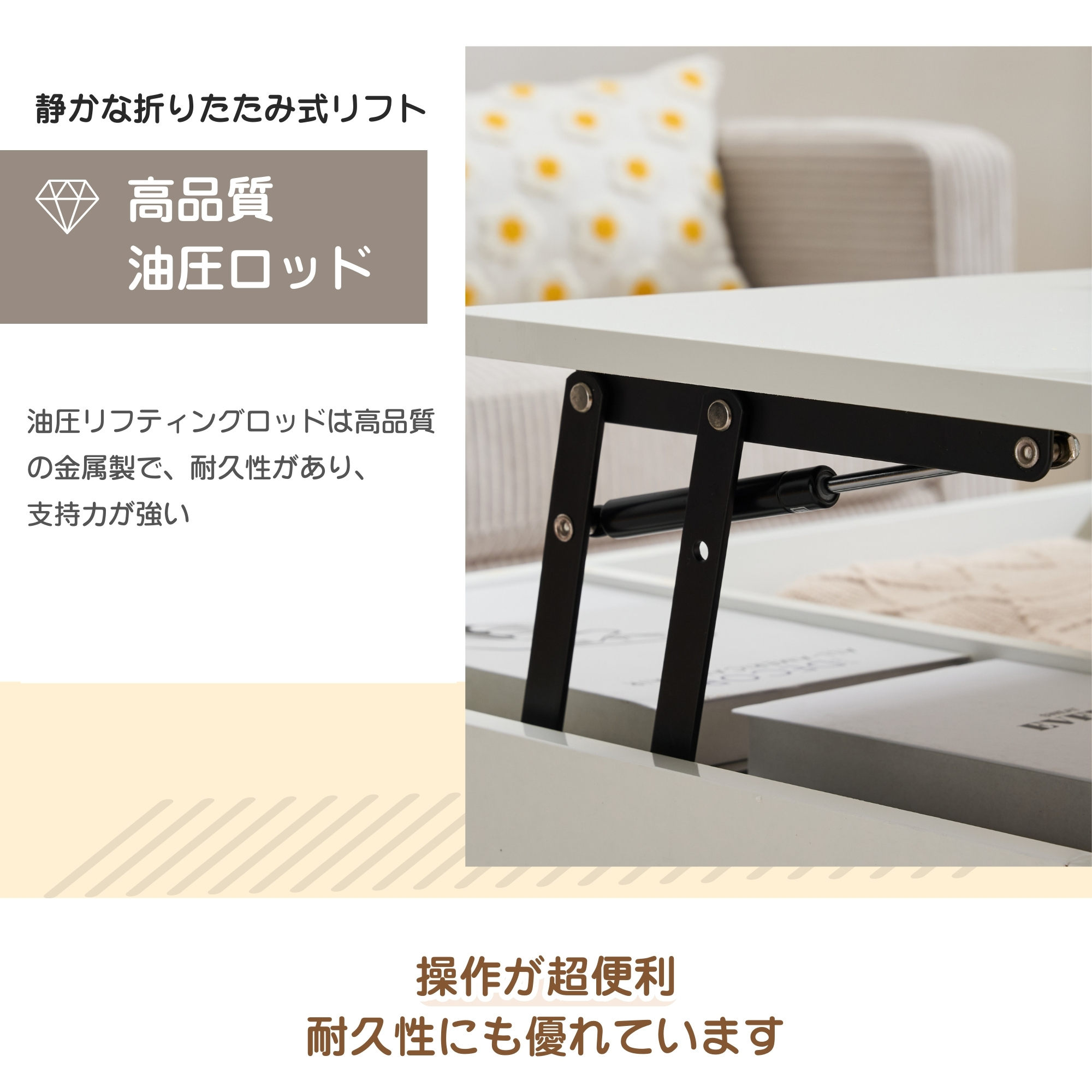 【選べる天板仕上げで、空間の印象が変わる】ブラック・ホワイトは光沢塗装仕上げで、光を映す上品な存在感。ナチュラルは木目を活かしたマット仕上げで、落ち着いた温もりのある印象に。お部屋のテイストや使うシーンに合わせて選べます【69×53cm、作業も食事も余裕のワークスペース】幅69×奥行53cmの天板は、ノートPCを広げても余裕のサイズ感。食事、PC作業、ミシン、趣味の作業台まで、1台で幅広く対応します【使わない時は隠せる、大容量の天板下収納】幅56×奥行41cmの収納スペース付き。ノートPCやリモコン、雑誌などをまとめて収納でき、テーブル周りをすっきり保てます【静かでスムーズな油圧リフト構造】金属製の油圧リフティングロッドを採用。開閉はスムーズで静か、毎日の使用でもストレスを感じません【高さ調節で、暮らしに合わせて使える】ローテーブルとしてくつろぎ時間に。作業テーブルとして仕事や趣味に。生活シーンに合わせて柔軟に使える高さ調節設計です