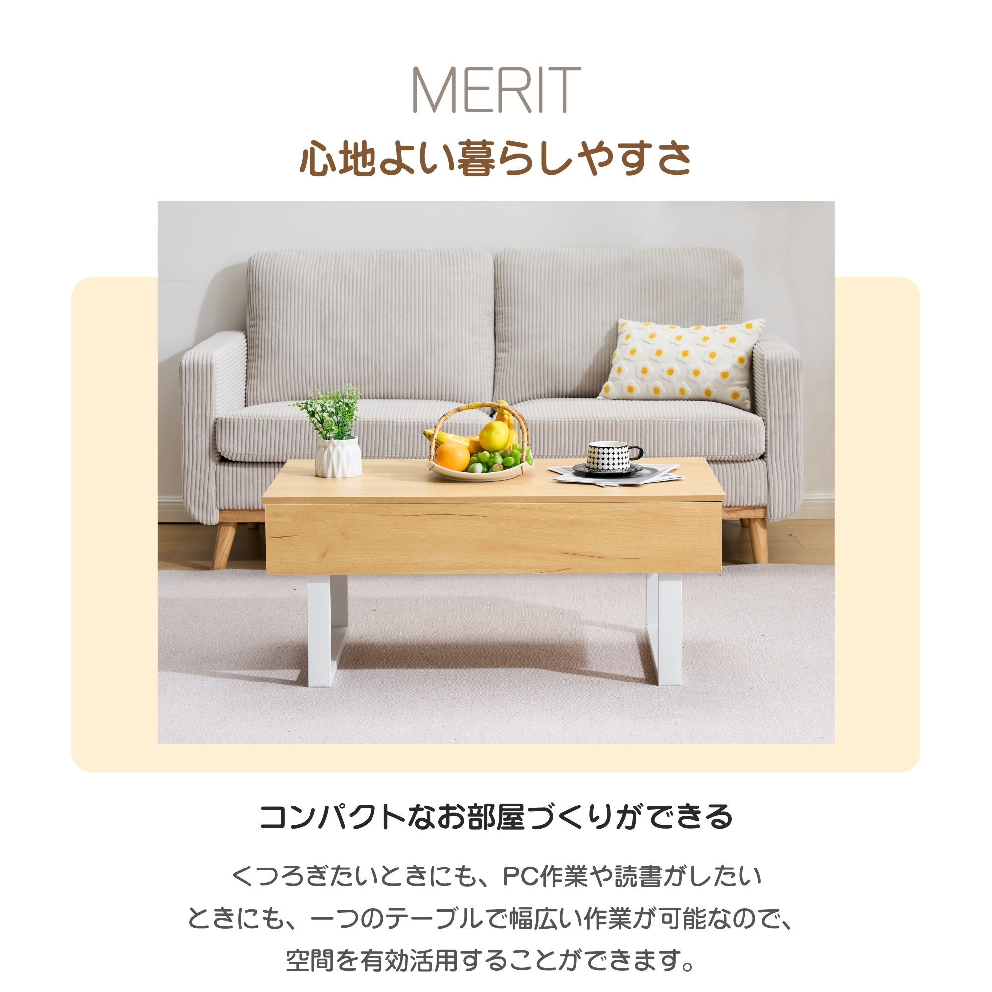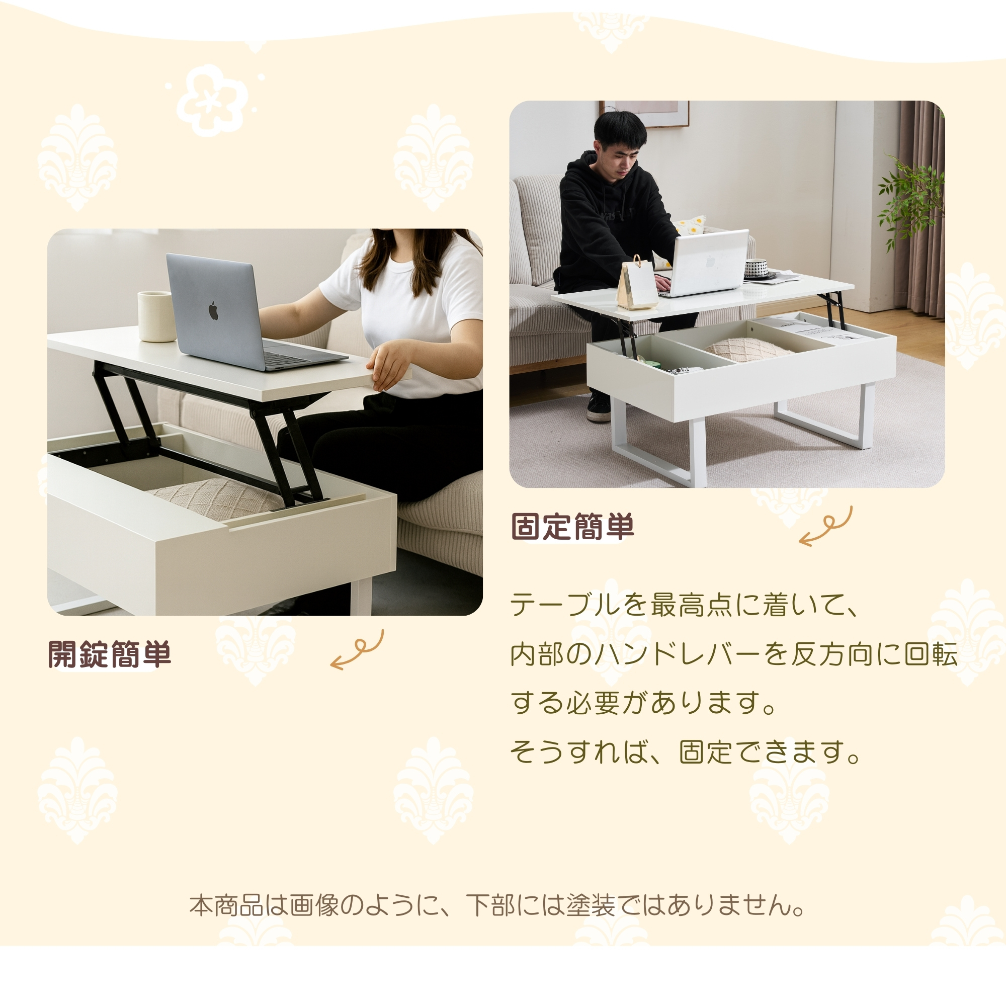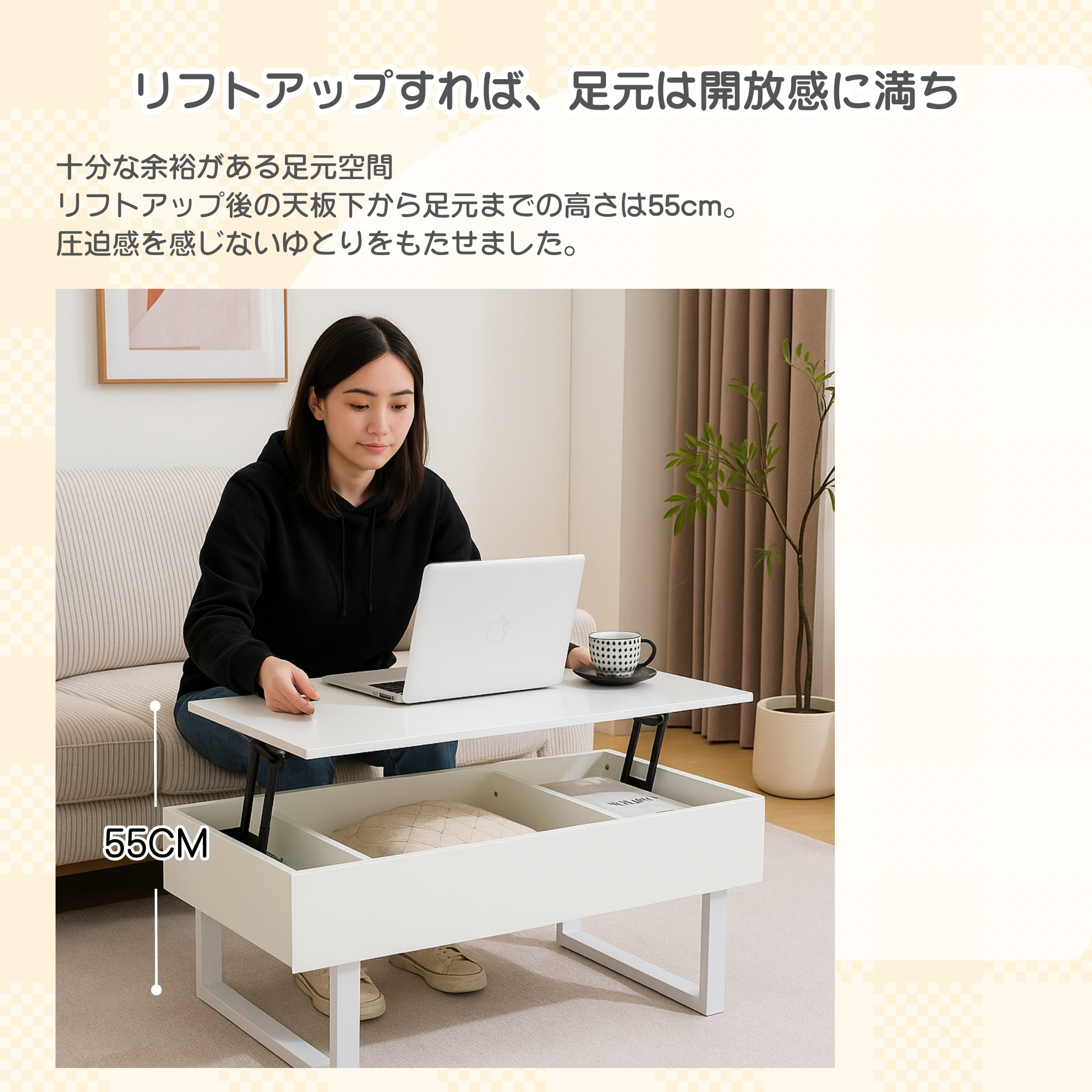 【選べる天板仕上げで、空間の印象が変わる】ブラック・ホワイトは光沢塗装仕上げで、光を映す上品な存在感。ナチュラルは木目を活かしたマット仕上げで、落ち着いた温もりのある印象に。お部屋のテイストや使うシーンに合わせて選べます【69×53cm、作業も食事も余裕のワークスペース】幅69×奥行53cmの天板は、ノートPCを広げても余裕のサイズ感。食事、PC作業、ミシン、趣味の作業台まで、1台で幅広く対応します【使わない時は隠せる、大容量の天板下収納】幅56×奥行41cmの収納スペース付き。ノートPCやリモコン、雑誌などをまとめて収納でき、テーブル周りをすっきり保てます【静かでスムーズな油圧リフト構造】金属製の油圧リフティングロッドを採用。開閉はスムーズで静か、毎日の使用でもストレスを感じません【高さ調節で、暮らしに合わせて使える】ローテーブルとしてくつろぎ時間に。作業テーブルとして仕事や趣味に。生活シーンに合わせて柔軟に使える高さ調節設計です