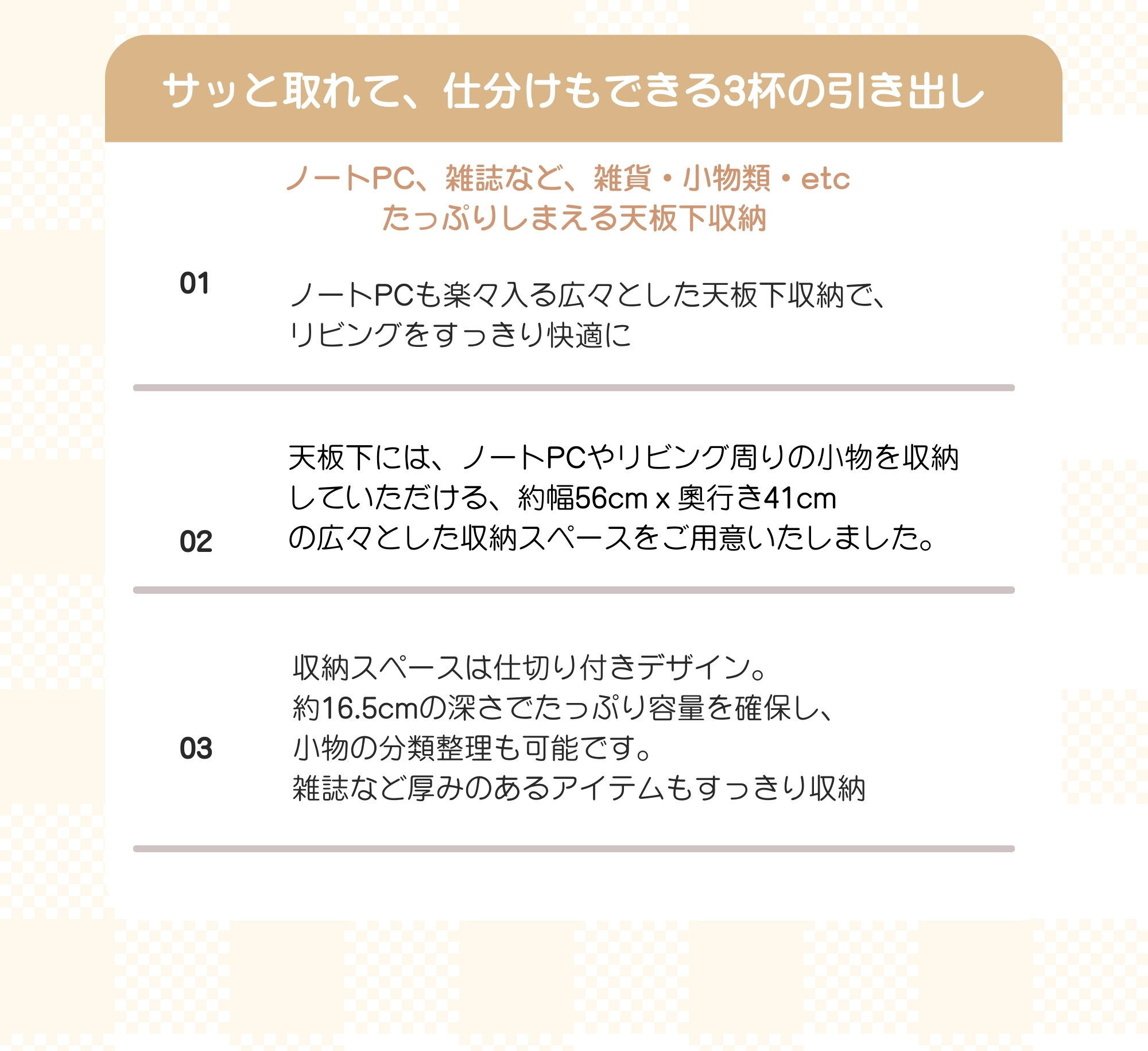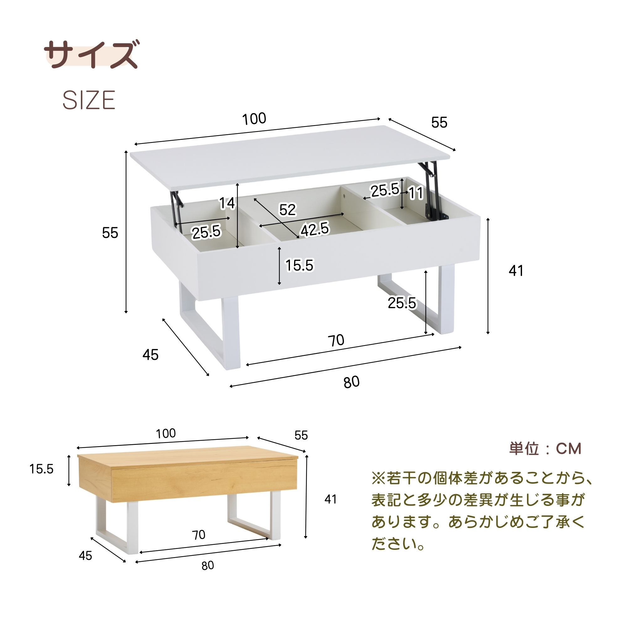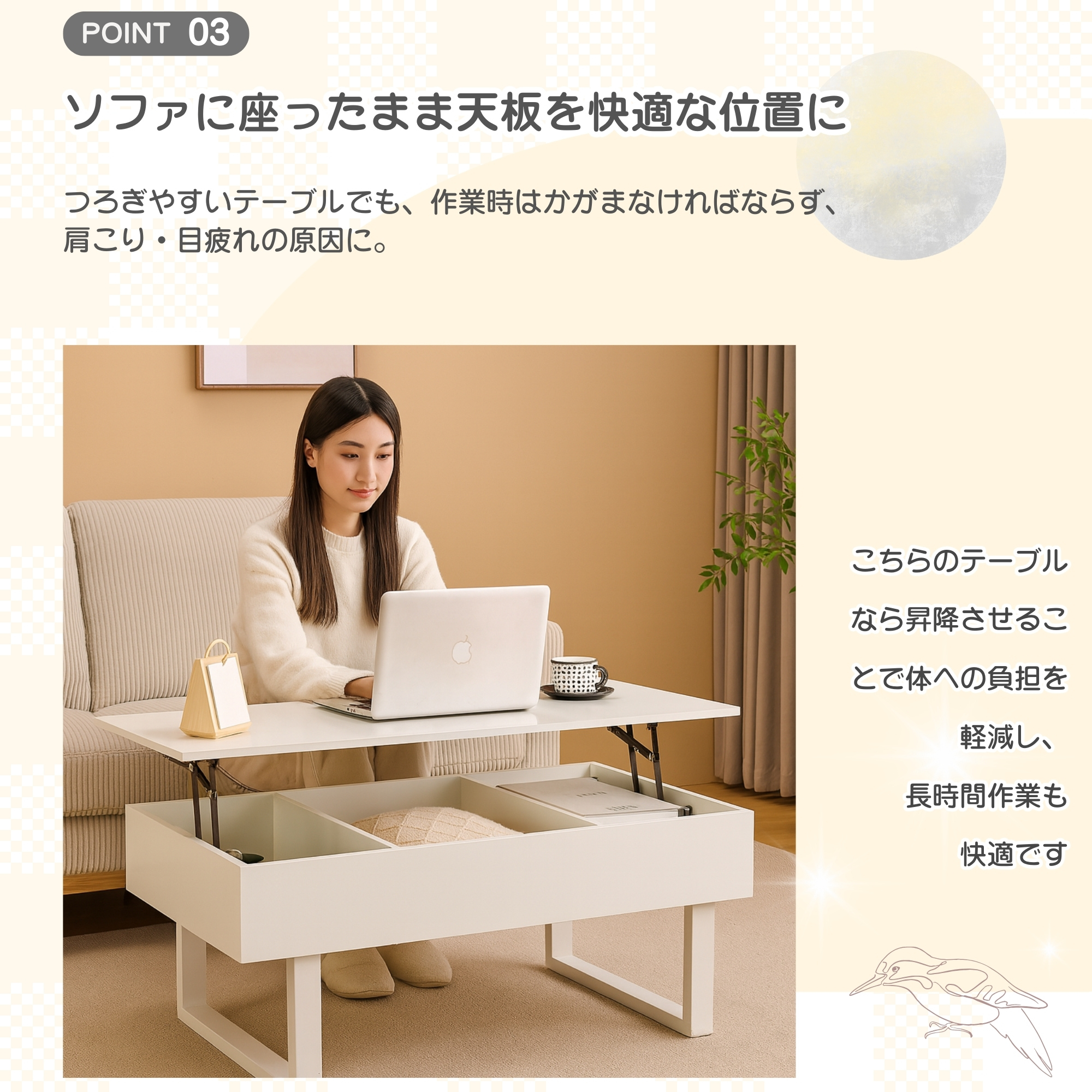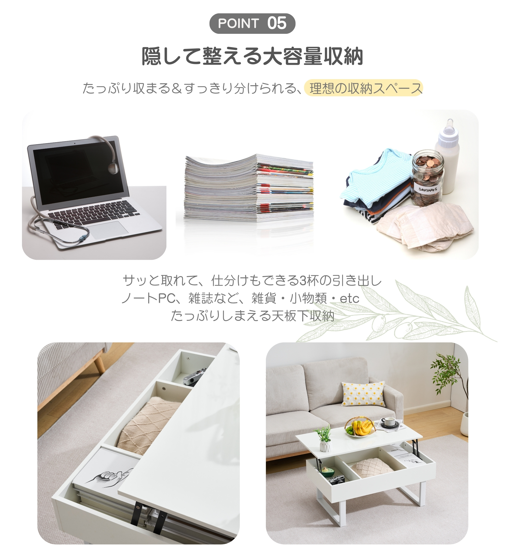 【選べる天板仕上げで、空間の印象が変わる】ブラック・ホワイトは光沢塗装仕上げで、光を映す上品な存在感。ナチュラルは木目を活かしたマット仕上げで、落ち着いた温もりのある印象に。お部屋のテイストや使うシーンに合わせて選べます【69×53cm、作業も食事も余裕のワークスペース】幅69×奥行53cmの天板は、ノートPCを広げても余裕のサイズ感。食事、PC作業、ミシン、趣味の作業台まで、1台で幅広く対応します【使わない時は隠せる、大容量の天板下収納】幅56×奥行41cmの収納スペース付き。ノートPCやリモコン、雑誌などをまとめて収納でき、テーブル周りをすっきり保てます【静かでスムーズな油圧リフト構造】金属製の油圧リフティングロッドを採用。開閉はスムーズで静か、毎日の使用でもストレスを感じません【高さ調節で、暮らしに合わせて使える】ローテーブルとしてくつろぎ時間に。作業テーブルとして仕事や趣味に。生活シーンに合わせて柔軟に使える高さ調節設計です