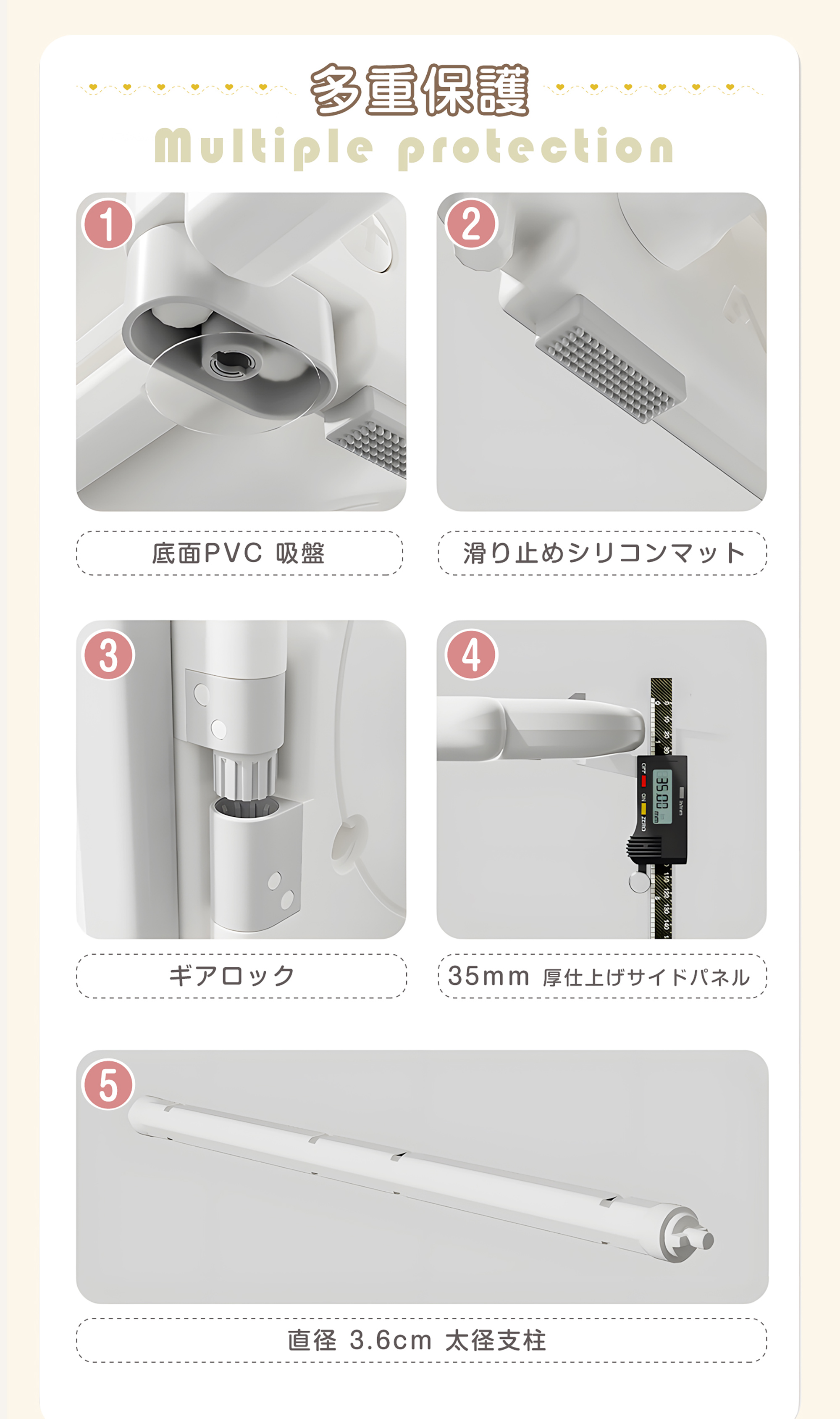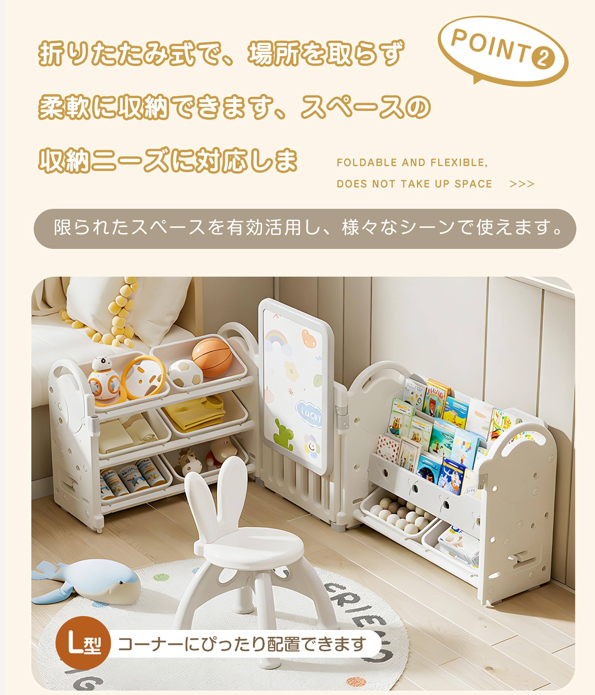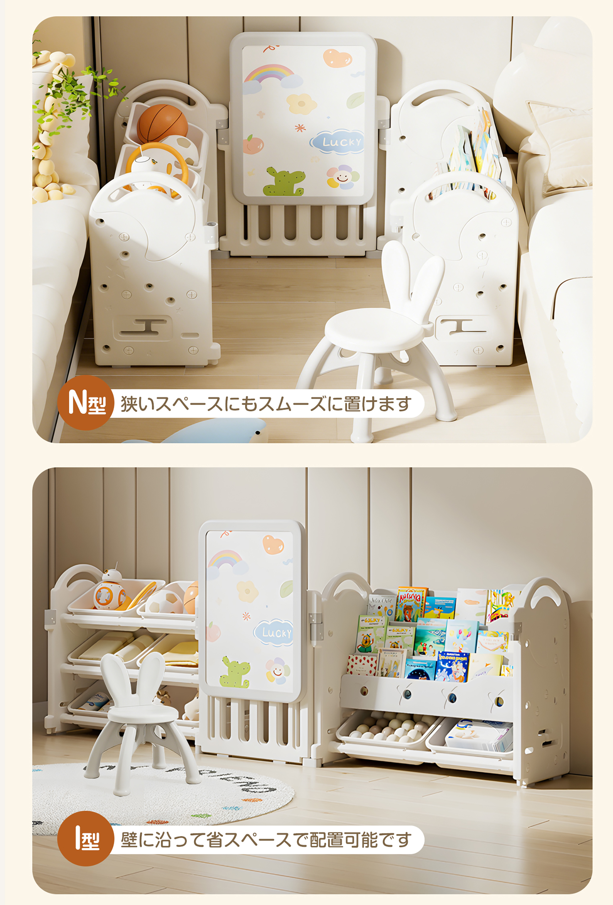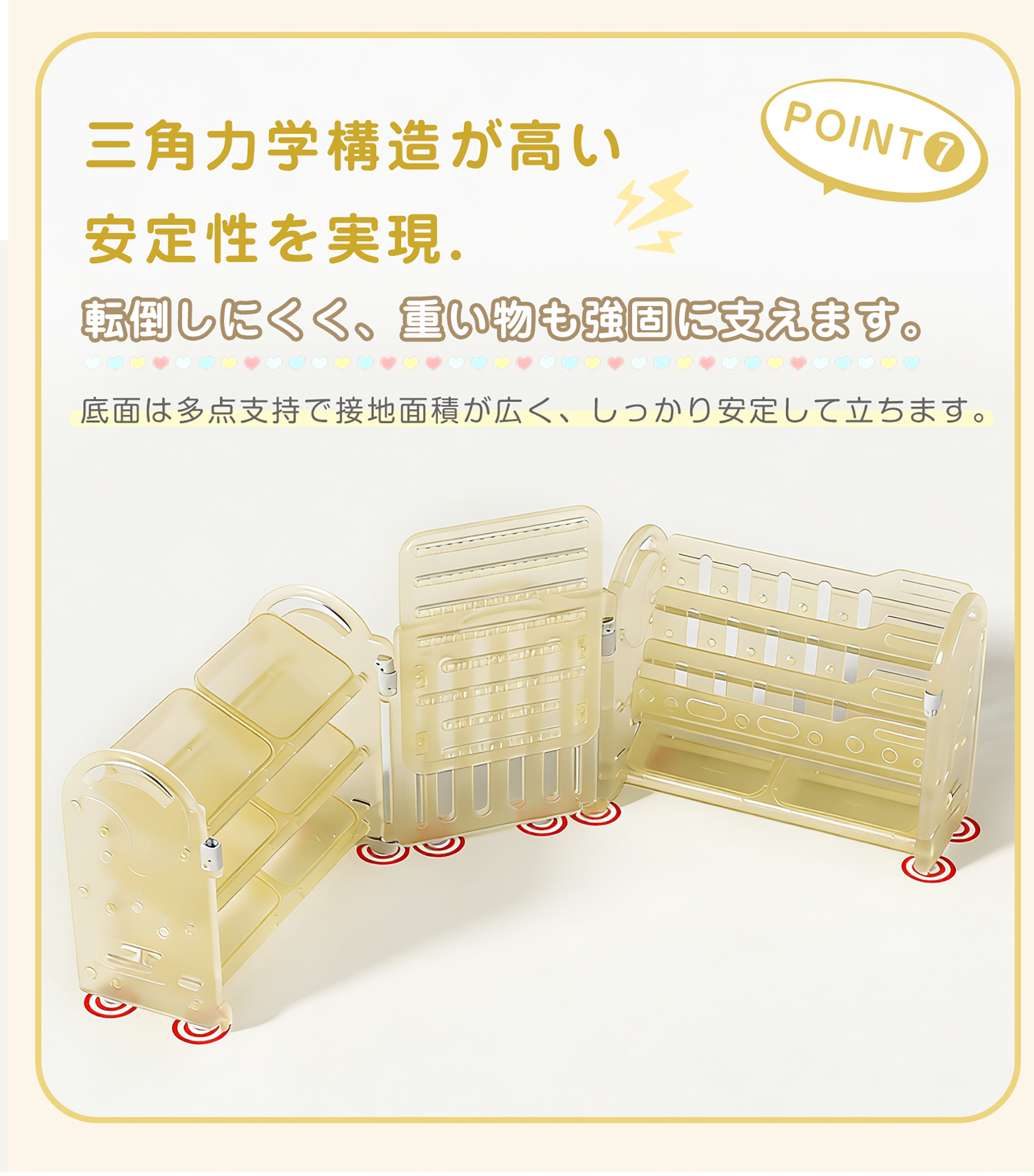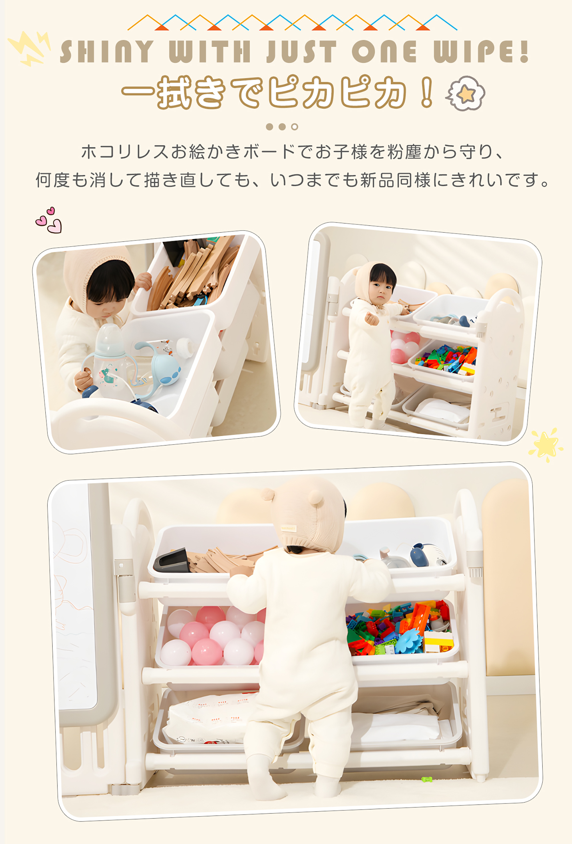 【6ボックスの大容量収納】各段に2つ、計6個の収納ボックスを備え、洋服・おもちゃ・小物・文具までまとめて整理【絵本収納で「自分で片づける力」を育む】表紙が見える絵本ラック設計で、お子さまが本を選びやすく、片づけも簡単。自分で整理する習慣が身につき、読書への興味と自主性を自然に育てます【コンパクト設計、省スペースでも置きやすい】省スペース設計で、リビング・子供部屋・学習デスク横などにも無理なく設置可能。限られた空間でも収納力をしっかり確保します【安全性に配慮したHDPE素材を使用】無毒・無臭で環境にも配慮されたHDPE(高密度ポリエチレン)素材を採用。お子さまが毎日触れるものだからこそ、安心して使える素材にこだわりました【滑り止め付きで安定感アップ】収納ボックスには滑り止め機能を搭載。出し入れ時にズレにくく、おもちゃや小物が落ちる心配を軽減します