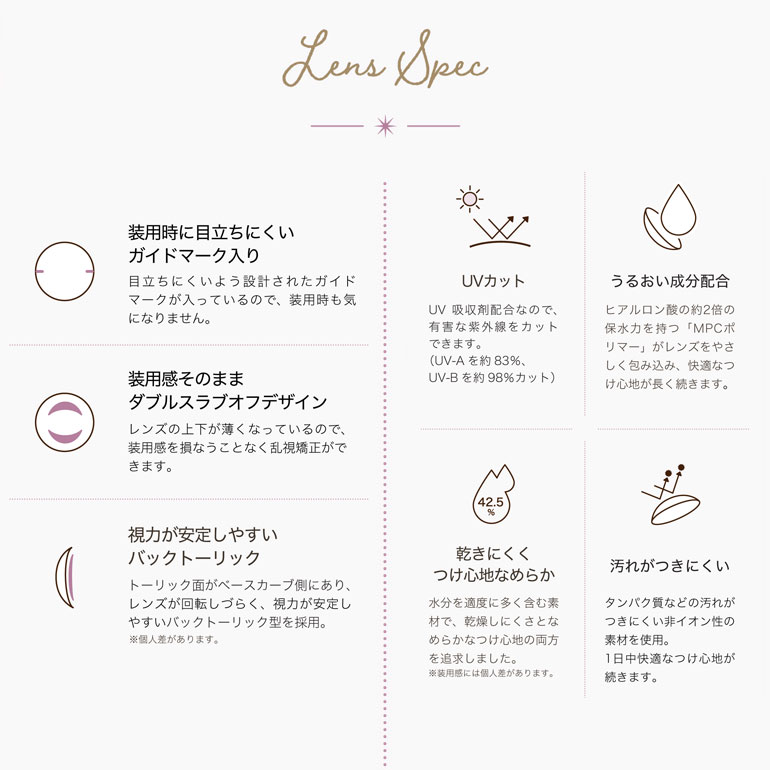 PWR(パワー):±0.00(度なし)、-0.50~-6.00(0.25step)、-6.50~-8.00(0.50step)