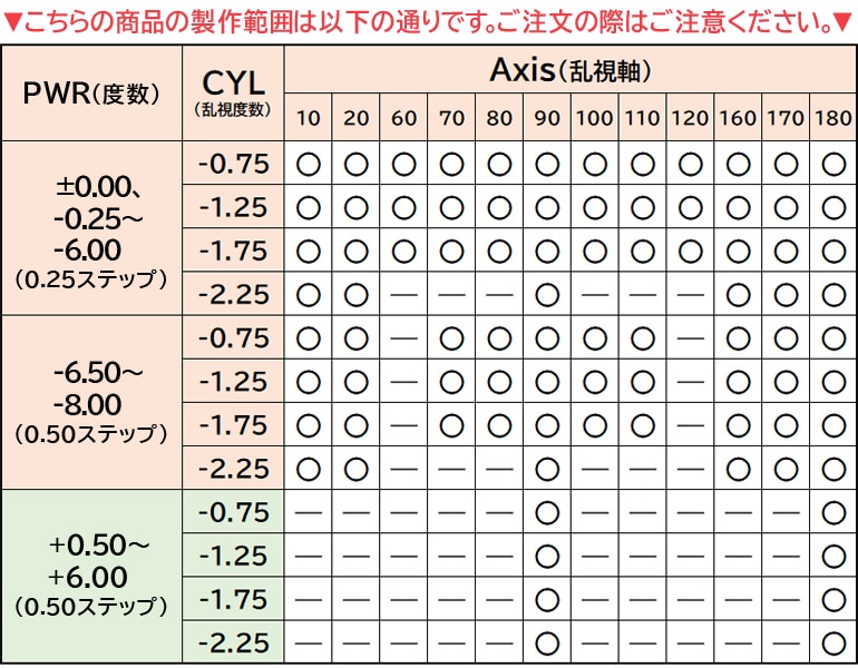 CYL(乱視度数):-0.75、-1.25、-1.75、-2.25