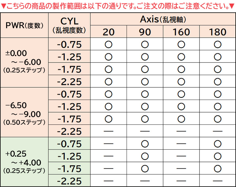 CYL(乱視度数):-0.75、-1.25、-1.75、-2.25