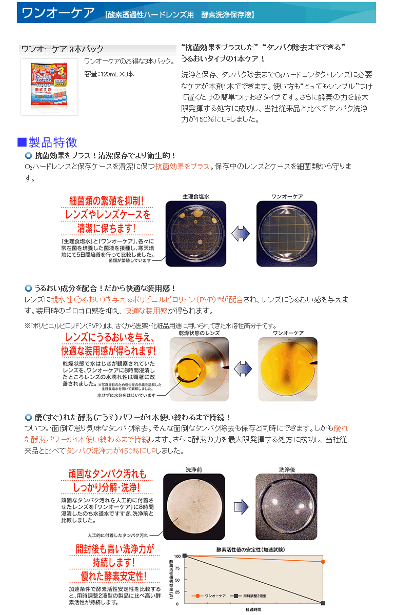 洗浄と保存、タンパク除去までO2ハードコンタクトレンズに必要なケアが本剤1本でできます。