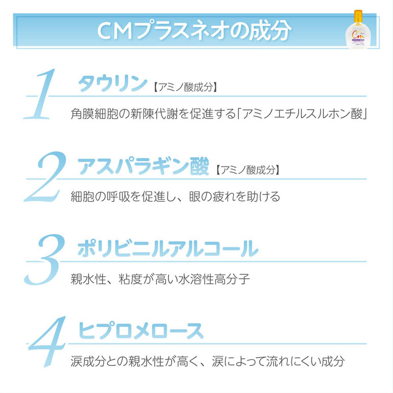 有効成分:ポリビニルアルコール(部分けん化物)…10mg、ヒプロメロース…6mg、塩化ナトリウム…2mg、タウリン…10mg、L-アスパラギン酸カリウム…1mg