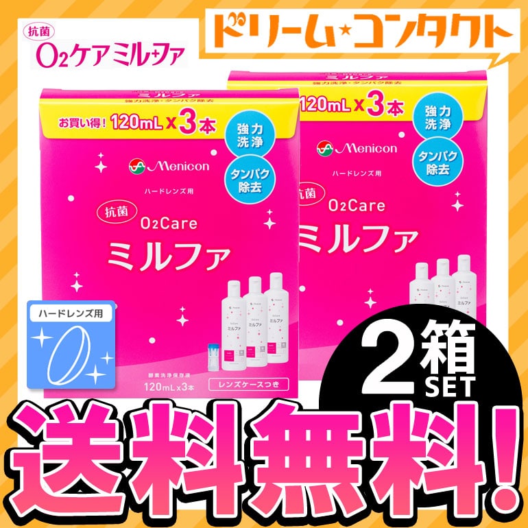 【送料無料】抗菌O2ケアミルファ3本パック 120ml×3本 2箱セット ハードレンズ用洗浄・保存・タンパク除去液 メニコン