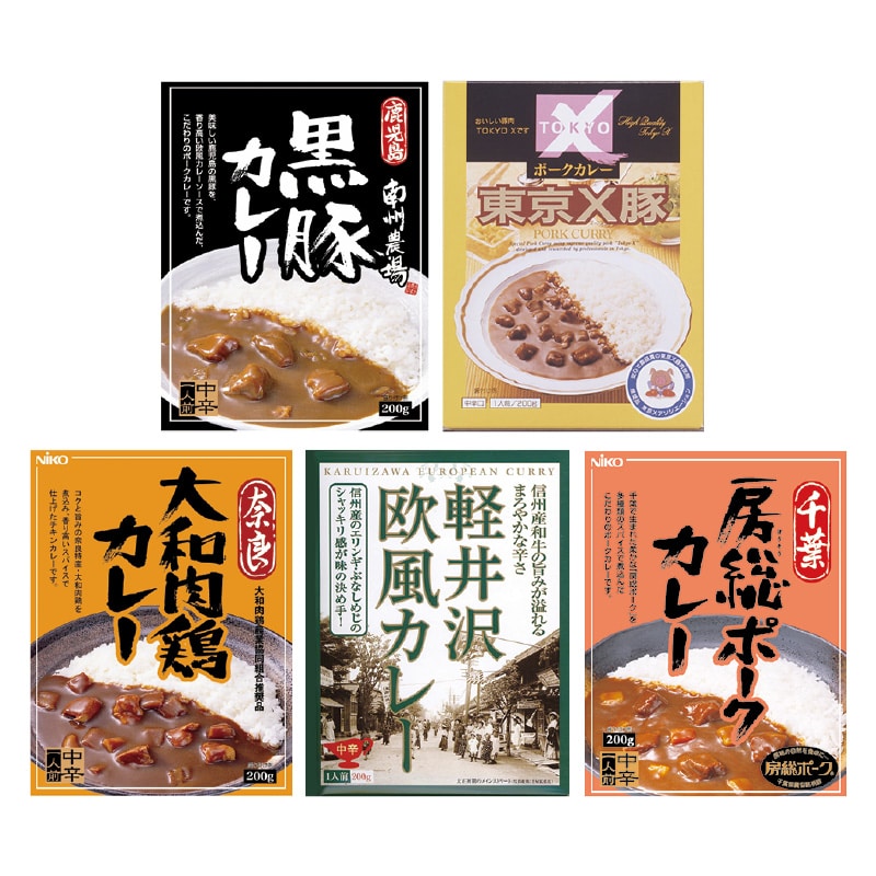 ●商品内容/南州農場黒豚カレー・東京X豚ポークカレー・大和肉鶏カレー・軽井沢欧風カレー・房総ポークカレー 各200g