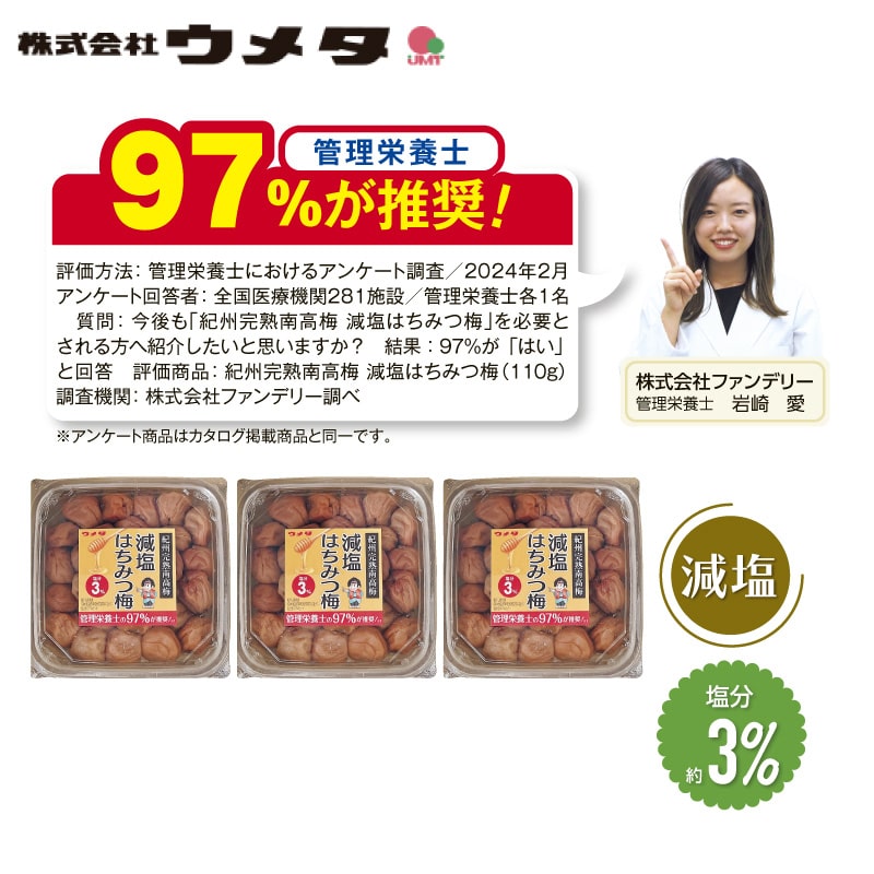 ウメタ 紀州南高梅減塩約3%はちみつ梅干3箱 送料込み