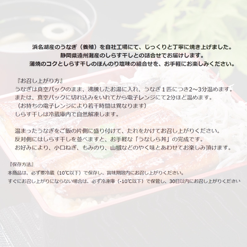 ●原料原産地/ウナギ(養殖)=浜名湖産 イワシの稚魚=静岡県遠州灘産