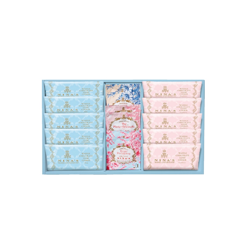 ●原産国/ニナス オリジナル マリー・アントワネット ティー・ジャスミン インペリアル=スリランカ製 ロイヤル ダージリン=インド製 ワッフルチョコレートサンドクッキー(プレーン・ストロベリー)=日本製
