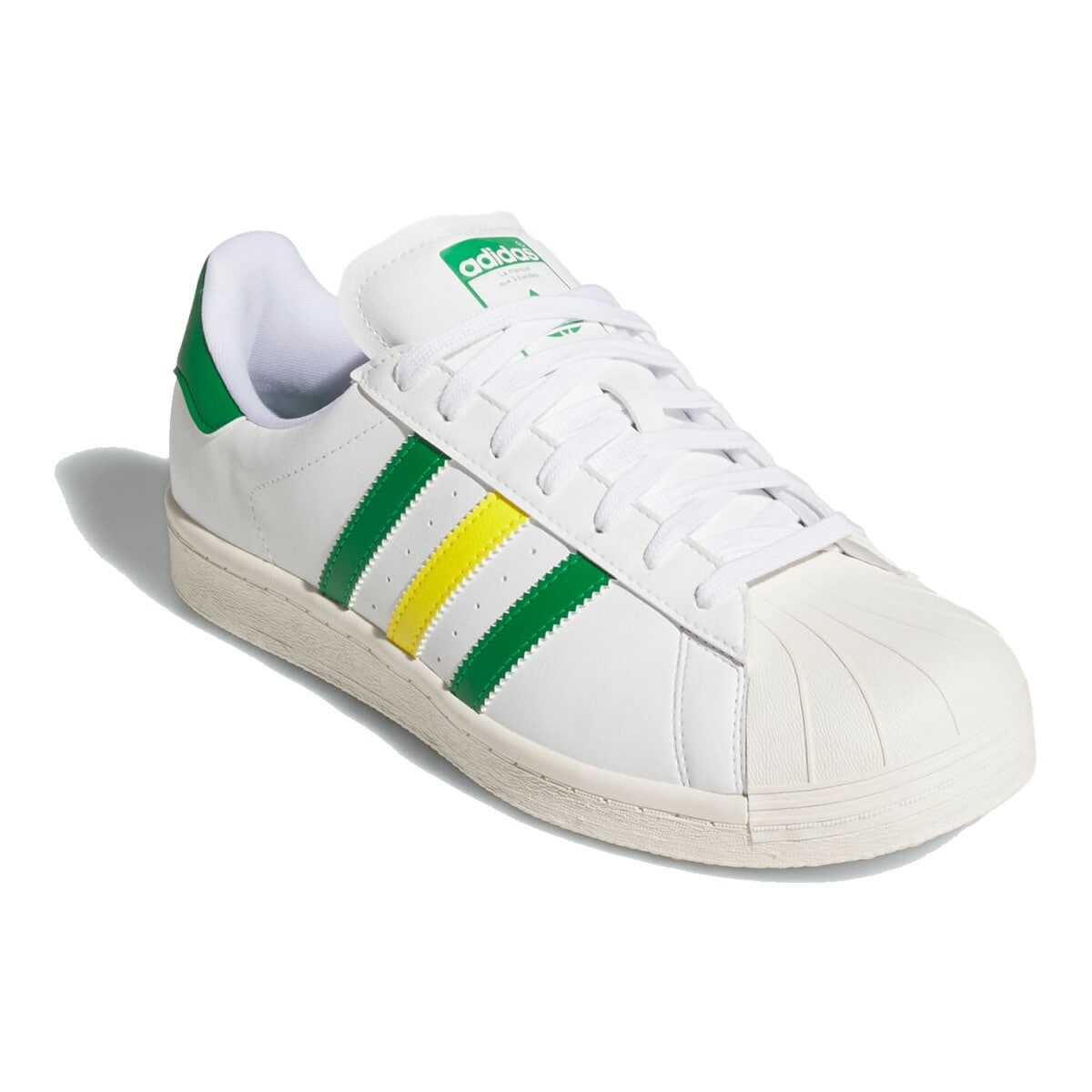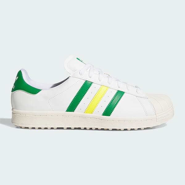 - 【商品説明】 スパイクレススーパースターゴルフシューズ。 アディダスが誇る名作スタイルのゴルフシューズで、レベルアップを目指そう。バスケットボールコートからゴルフコースに活躍の場を移した、スパイクレスシューズ。フルグレインレザーアッパーに、ひと目でスーパースターとわかるラバーシェルトゥを合わせた、ゴルフ場でひと際目を引くデザイン。足裏には、スイング時にしっかり地面を踏みしめられる、グリップ力のあるスパイクレスアウトソールを組み合わせている。 ※「SuperStar」は、株式会社ムーンスターの日本における登録商標です。 【商品特徴】 ・レギュラーフィット ・合成アッパー ・アイコニックなラバーシェルトゥ ・テキスタイルライニング ・芝でのプレーに適したラバーアウトソール 【素材】 甲:合成皮革/底:ゴム底 【重量】 約385g(25.5cm片足) 【足幅】 EE相当 【カラー】 クラウドホワイト/グリーン/イエロー(IH8535) 【サイズ】 22.5cm、23cm、23.5cm、24cm、24.5cm 【原産地】 中国