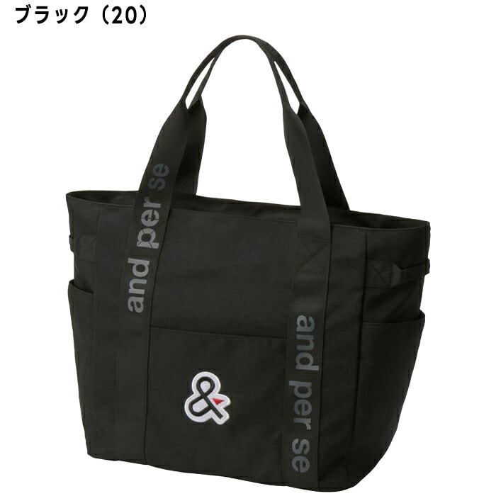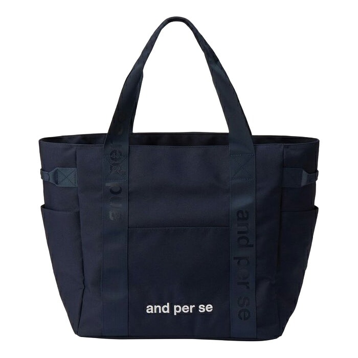 - 【商品説明】 and per se の定番トートバッグ。 厚手で丈夫なオックス生地を使用。 ブランドロゴの刺繍と&マークのワッペンを施しデザインを一新。 アウトポケットがたくさんついているので小物の出し入れも便利な使い勝手の良いデザインです。 外側にポケット4つ付きで、スマホや500mlボトルの収納に便利です。 同シリーズでカートバッグ、ボールポーチ、スコープケースもご用意しているので、コーディネートもオススメです。 【素材】 表地:ポリエステルオックス(ポリエステル100%) 裏地:ポリエステル100% 【サイズ】 H38×W56×D24cm