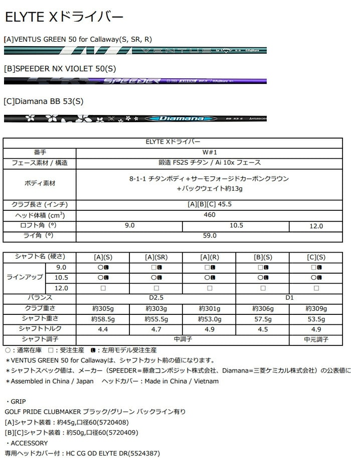 ■フェース素材/構造:鍛造 FS2S チタン/Ai 10x フェース ■ボディ素材:8-1-1 チタンボディ+サーモフォージドカーボンクラウン+バックウェイト約13g ■クラブ長さ(インチ):45.5 ■ヘッド体積(cm3):460 ■ロフト角:10.5度 ■ライ角:59.0 ■シャフト:Diamana BB 53(S) ■バランス:D1 ※専用ヘッドカバー付き