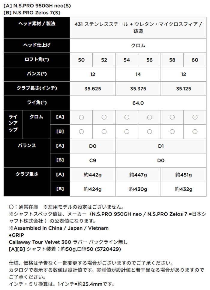 ![キャロウェイ CB12 ウェッジ N.S.PRO 950GH neo/N.S.PRO Zelos 7 スチールシャフト 2025年モデル[Callaway][日本仕様 日本正規品] 50度-12度 N.S.PRO 950GH neo(S)](https://anamall.ana.co.jp/contents/0127/img/goods/allimg/cl-wd-cb12_4.jpg)