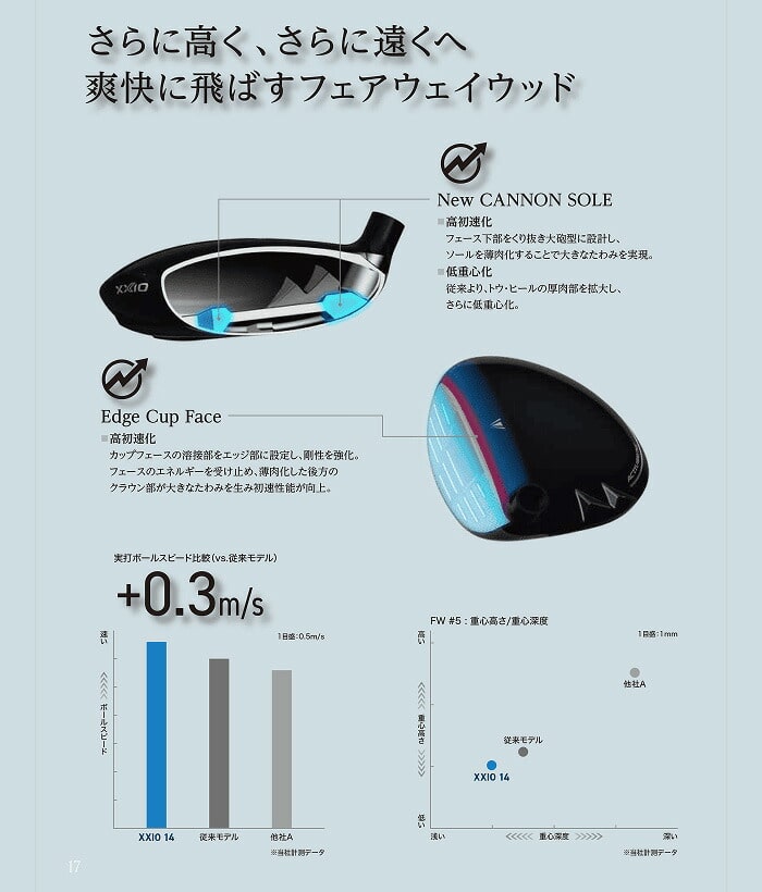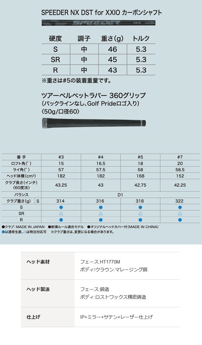 - 一撃の飛びのゼクシオ。 新素材VR-チタンを世界初採用。 さらに高く、さらに遠くへ。 豪快に飛ばすフェアウェイウッド。 【ヘッド素材】 フェース:HT1770M ボディ/クラウン:マレージング鋼 【ヘッド製法】 フェース:鍛造 ボディ:ロストワックス精密鋳造 【仕上げ】 高輝度メタリック塗装 IP+ミラー+サテン+レーザー仕上げ 【番手】 #3、#4、#5、#7、#9 【ロフト角】 15度(#3)16.5度(#4)18度(#5)20度(#7)23度(#9) 【ライ角】 57度(#3)57.5度(#4)58度(#5)58.5度(#7)59度(#9) 【ヘッド体積】 182cm3(#3)182cm3(#4)168cm3(#5)152cm3(#7)133cm3(#9) 【クラブ長さ(インチ)】 43.5(#3)43.25(#4)43(#5)42.5(#7)42(#9) 【バランス】 D3 【クラブ重さ(R)】 287(#3)288(#4)290(#5)294(#7)298(#9)