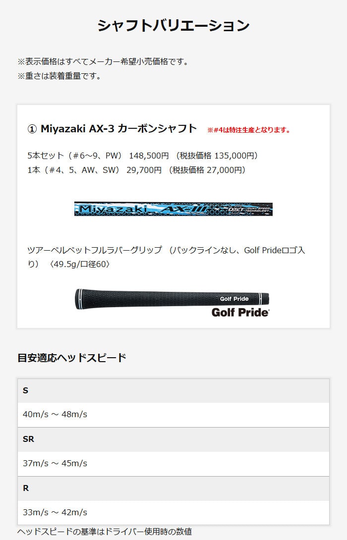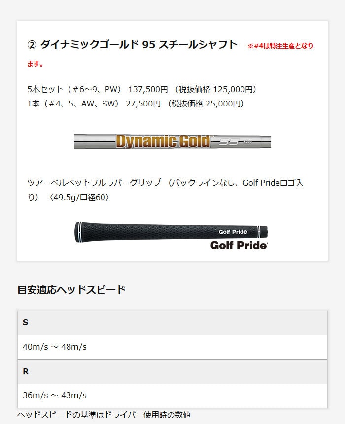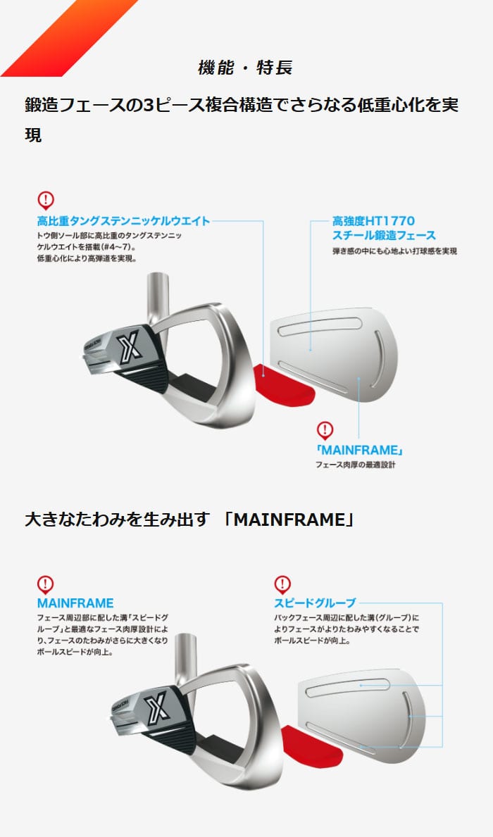 【商品説明】 薄肉鍛造フェースと「MAIN FRAME」構造に加え、大型高比重タングステンニッケルウエイトを搭載し高弾道で大きな飛び。 シャープな形状で打ちやすい、ゼクシオ エックス アイアン。 【素材】 フェース:HT1770 (#4~7)ボディ:SUS431+高比重タングステンニッケルウエイト (#8~SW)ボディ:SUS431 【シャフト】 Dynamic Gold 95 【ご注意】 お客様都合(サイズが合わない、イメージと違う等)での返品及びキャンセルはお受け出来ません。予めご了承下さい。
