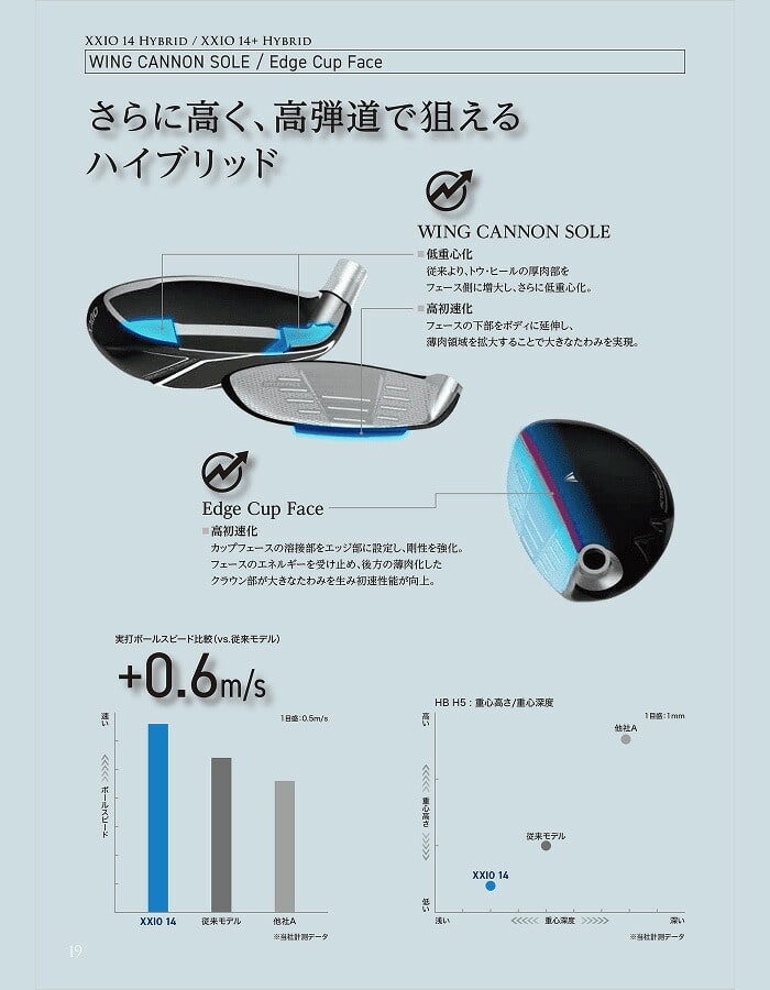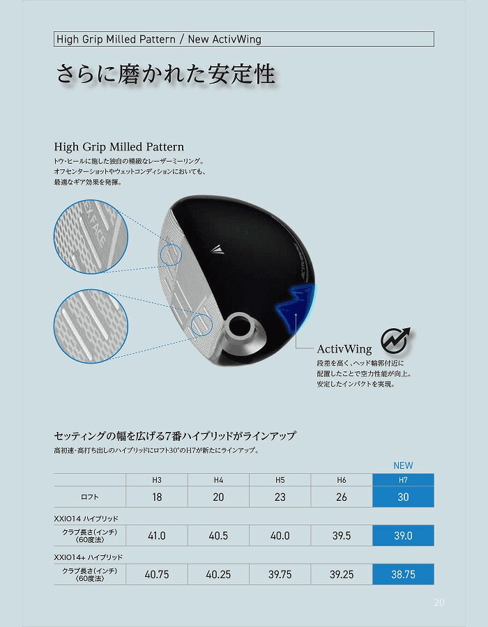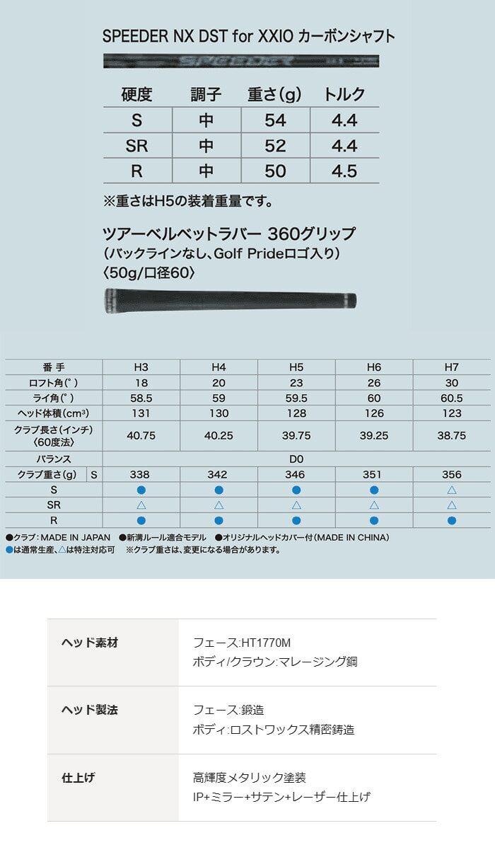- 一撃の飛びのゼクシオ。 新素材VR-チタンを世界初採用。 さらに高く、高弾道で狙える ハイブリッド 【ヘッド素材】 フェース:HT1770M ボディ/クラウン:マレージング鋼 【ヘッド製法】 フェース:鍛造 ボディ:ロストワックス精密鋳造 【仕上げ】 高輝度メタリック塗装 IP+ミラー+サテン+レーザー仕上げ 【番手】 H3、H4、H5、H6、H7 【ロフト角】 18度(H3)20度(H4)23度(H5)26度(H6)30度(H7) 【ライ角】 58.5度(H3)59度(H4)59.5度(H5)60度(H6)60.5度(H7) 【ヘッド体積】 131度(H3)130度(H4)128度(H5)126度(H6)123度(H7) 【クラブ長さ(インチ)】 41度(H3)40.5度(H4)40度(H5)39.5度(H6)39度(H7) 【バランス】 D1 【クラブ重さ(S)】 319(H3)323(H4)328(H5)333(H6)338(H7)