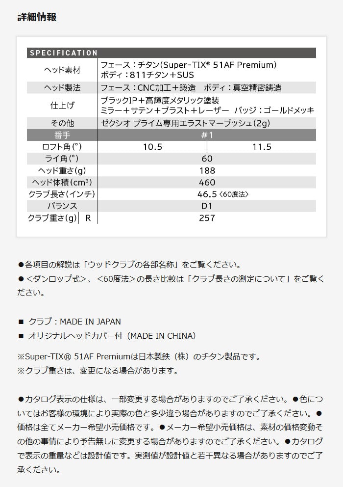 【商品説明文】 高く、強く、遠くへ飛ぶパフォーマンス。 飛ばすことが楽しくなるゼクシオプライムドライバー。 【ヘッド素材】 フェース:チタン(Super-TIX51AFPrermiumn) ボディ:811チタン+SUS 【シャフト】 XXIOPRIMESP-1300カーボンシャフト