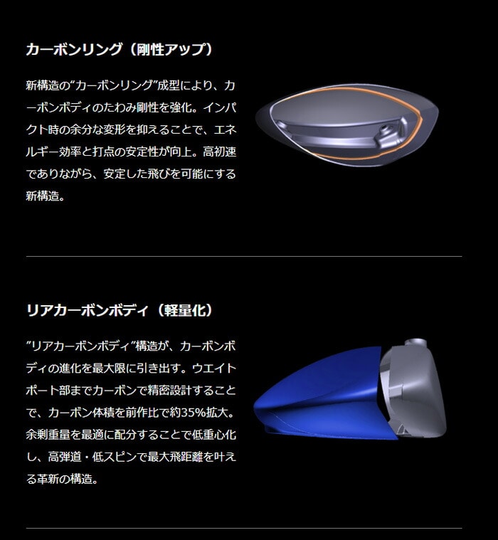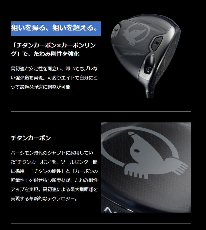 - 狙いを操る、狙いを超える。 ●「チタンカーボン×カーボンリング」で、たわみ剛性を強化 高初速と安定性を両立し、叩いてもブレない強弾道を実現。可変ウエイトで自分にとって最適な弾道に調整が可能 ●チタンカーボン パーシモン時代のシャフトに採用していた“チタンカーボン”を、ソールセンター部に採用。 「チタンの剛性」と「カーボンの軽量性」を併せ持つ新素材が、たわみ剛性アップを実現。 高初速による最大飛距離を実現する革新的なテクノロジー。 ●カーボンリング(剛性アップ) ●リアカーボンボディ(軽量化) ●粘りの「BLUE」VIZARDBLUE 全層にトレカT1100G素材を採用することで挙動を安定させ、正確で分厚いインパクトを実現 【ロフト角(度)】9.0/10.5 【ヘッド素材/製法】Ti811ボディ/鋳造+カーボン+タングステンウエイト+アルミ+SJ221チタンフェース/鍛造 【ヘッド体積(cm3)】460 【ライ角(度)】58.0 【長さ(インチ)※60度法】45.5 【バランス/総重量(g)】 50S:D2/約311g 60S:D2.5/約318g 【グリップ】GRHONMARUBBERM60XWH ※詳しいスペックは商品画像をご確認ください。