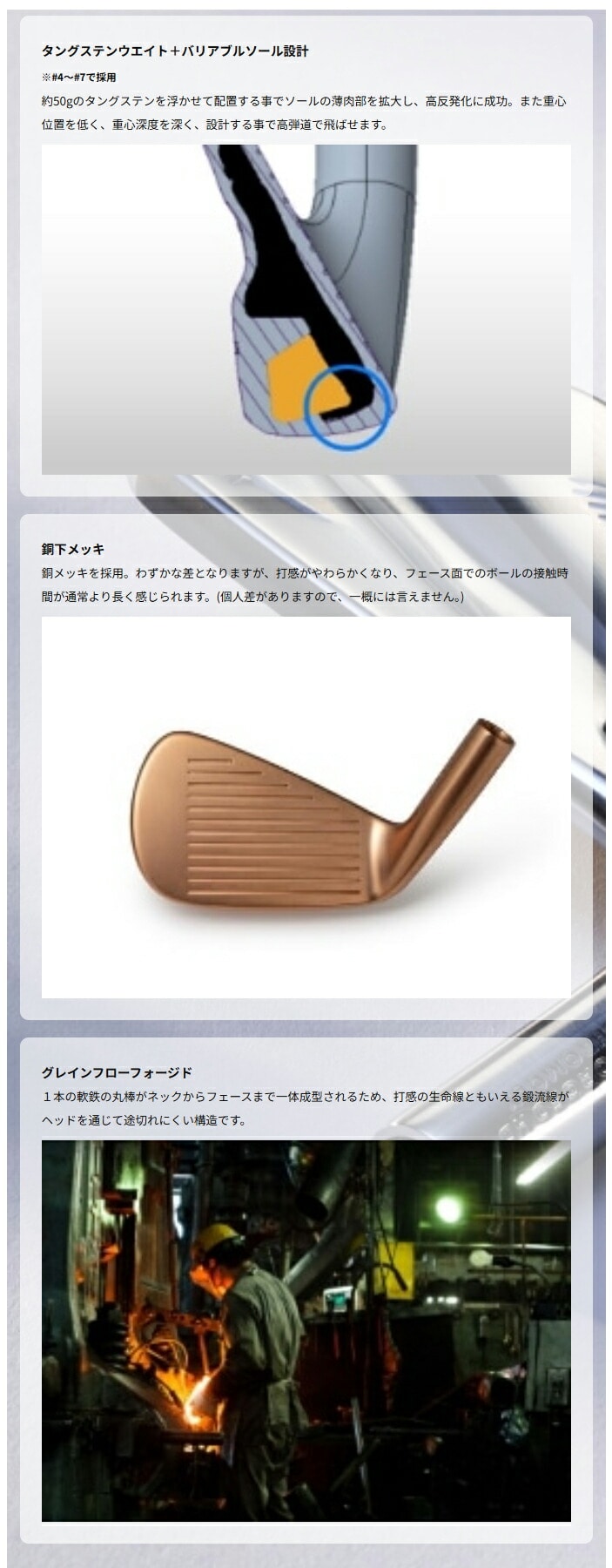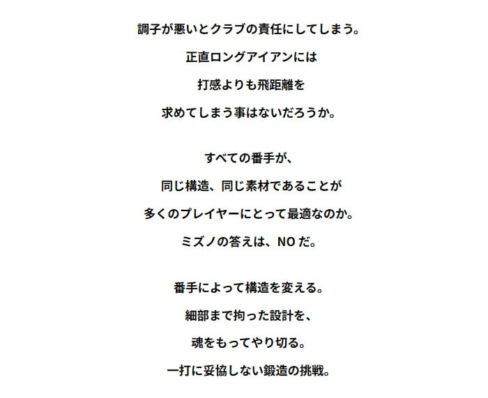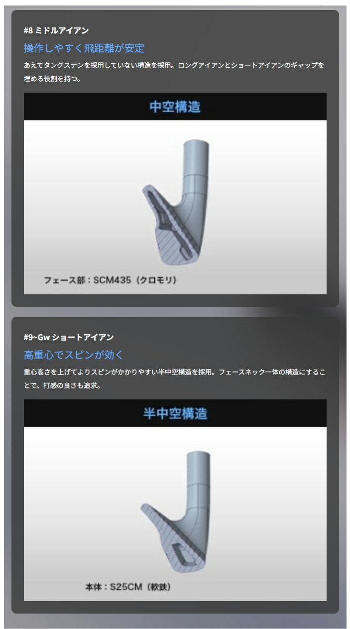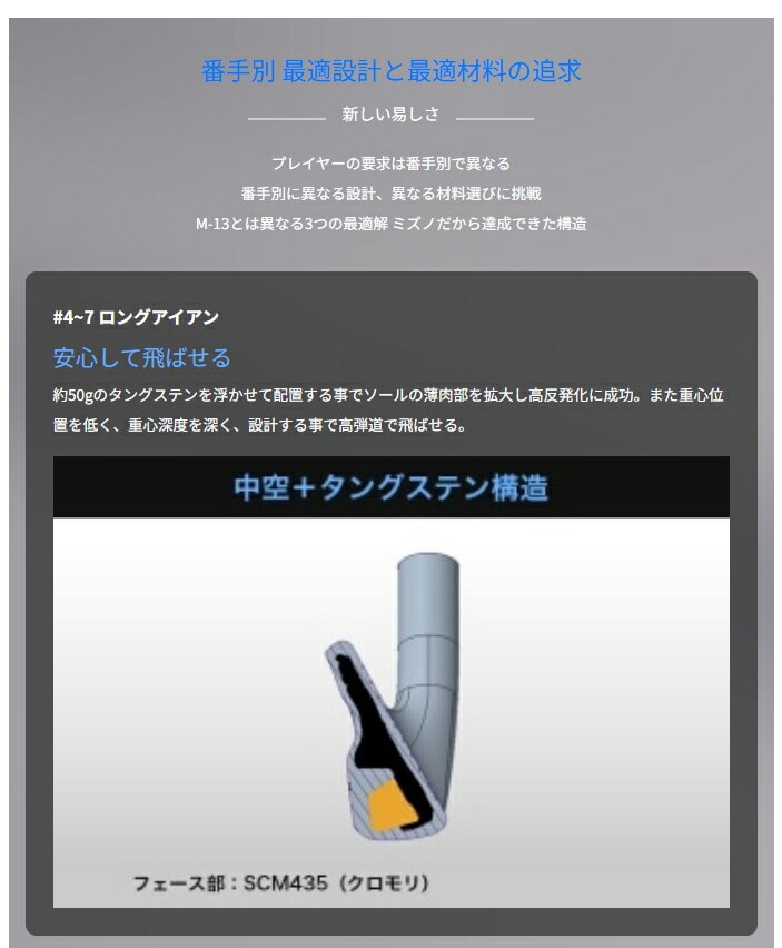 - 【素材】 ●単品 No.4 フェースネック:クロムモリブデン鋼(SCM435)精密鍛造/4135 バック:ソフトステンレススチール(SUS431)精密鋳造、タングステンウェイト GW フェースネック:マイルドスチール(S25CM)精密鍛造/1025E バック:ソフトステンレススチール(SUS431)精密鋳造 ●アイアンセット No.5~8 フェースネック:クロムモリブデン鋼(SCM435)精密鍛造/4135 バック:ソフトステンレススチール(SUS431)精密鋳造、タングステンウェイト(No.5~7のみ) No.9、PW フェースネック:マイルドスチール(S25CM)精密鍛造/1025E バック:ソフトステンレススチール(SUS431)精密鋳造 【原産国】 日本製 【シャフト】 TRAVIL85カーボンシャフト(S/88g) 【グリップ】 ゴルフプライドM31ラバーグリップ(ミズノオリジナル)(43ME88000)口径M60/49g 【ロフト角(度)】 No.4/20、No.5/23、No.6/26、No.7/29、No.8/33、No.9/38、PW/43、GW/48 【仕上げ】 ニッケルクロム銅下メッキ・サテン仕上げ、EFバッジ 【クラブ質量】 S/約408g(No.7:参考値) ※詳しいスペックは商品画像をご確認ください。