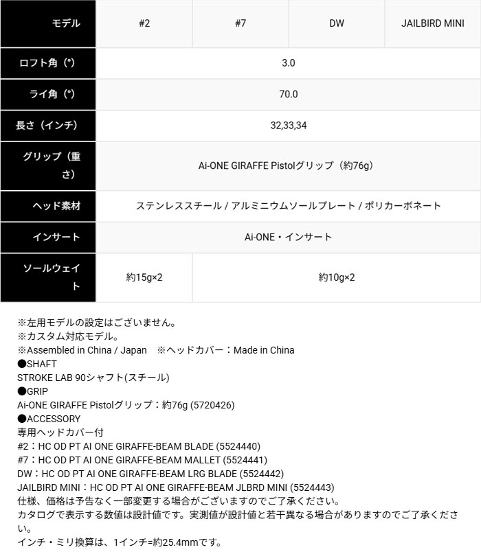 - 【商品説明文】 ユニークなロングネックパター、 キリンがAIと融合してさらに進化! ロングネックと斬新なデザインで話題となったGIRAFFE-BEAMパターがAI融合したことで「Ai-ONEGIRAFFE-BEAMパター」として発売されることになりました。 削減できた重さをトウとヒールに振り分け、そこにホワイト・ホットインサートからスイッチされたAi-ONE・インサートの性能も加わることで、オフセンターヒットに対する強さは大きく向上しています。 ヘッドラインアップには、#2、DW、#7、JAILBIRDMINIの4種類を用意。 すべてにSTROKELAB90シャフトを装着しています。 【ロフト角】 3.0 【ライ角】 70.0 【インサート】 Ai-ONE・インサート 【ソールウェイト】 #2:約15g×2 #7/DW/JBM:約10g×2 【ヘッド】 ステンレススチール/アルミニウムソールプレート/ポリカーボネート 【シャフト】 STROKELAB90 【グリップ】 Ai-ONEGIRAFFEPistolグリップ(約76g)