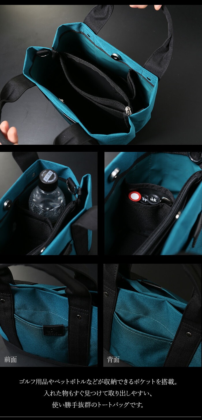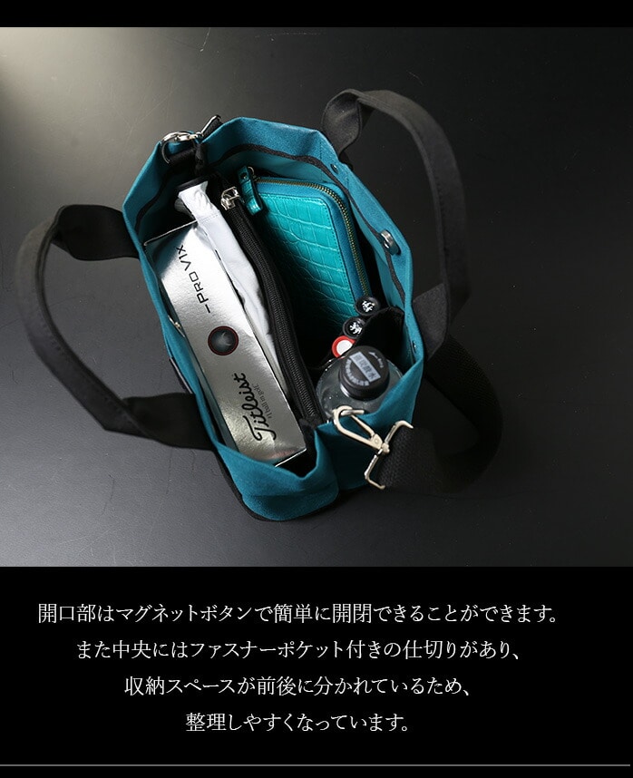- ●収納力にこだわりました。 小型なのに収納力・機能性が抜群! ゴルフシーンでも休日のお出かけバッグとしても使える トートバッグが登場です。 ゴルフ用品やペットボトルなどが収納できるポケットを搭載。 入れた物もすぐ見つけて取り出しやすい、 使い勝手抜群のトートバッグです。 開口部はマグネットボタンで簡単に開閉できることができます。 また中央にはファスナーポケット付きの仕切りがあり、 収納スペースが前後に分かれているため、 整理しやすくなっています。 ●2WAY仕様の万能バッグ トートバッグとしてもショルダーバッグとしても使える2WAYタイプ。 付属のショルダーストラップをつければ、 両手が空いてアクティブに動けるショルダースタイルに早変わり。 【カラー】チャコールグレー/オフホワイト/ブラック/グラスグリーン 【仕様】 ・内部仕様(仕切り×2、ファスナーポケット×1、大ポケット×1、中ポケット×1、小ポケット×1、ペットボトルポケット×1) ・外部仕様(小ポケット×2) 【材質】 ・本体:ポリエステル75%、PVC25% ・紐:綿100% ・金具:亜鉛合金 【サイズ】 ・縦:20cm ・上部横:28cm ・下部横:22.5cm ・マチ:15cm