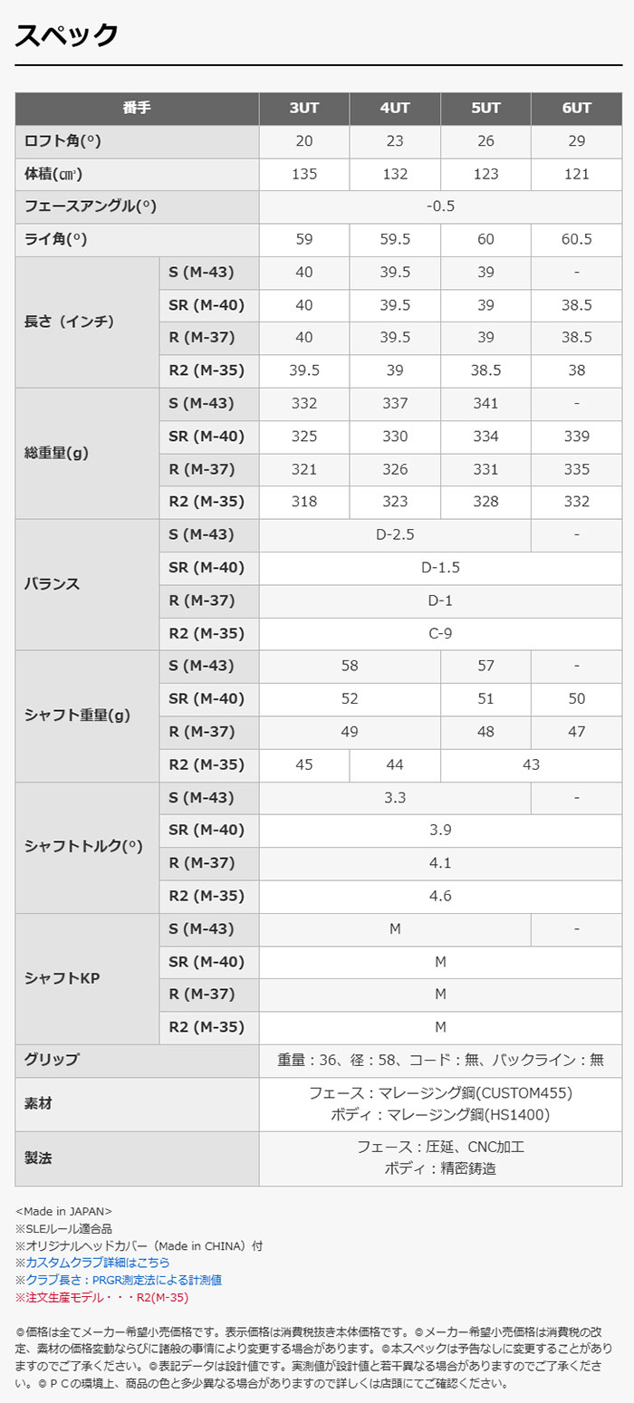 - 高弾道、高初速で狙う、 ユーティリティ。 RSSPEEDのユーティリティは、シャローデザインで、やや大型なヘッドシェイプ。 直打ちギアとしてのやさしさを持たせながら、低・深重心設計で高弾道を実現。 【ロフト角】20度(3UT)/23度(4UT)/26度(5UT)/29度(6UT) 【体積(cm3)】135(3UT)/132(4UT)/123(5UT)/121(6UT) 【フェースアングル(度)】-0.5 【ライ角)】59度(3UT)/59.5度(4UT)/60度(5UT)/60.5度(6UT) 【バランス】 ・D-2.5(S) ・D-1.5(SR) ・D-1 ・C-9 【グリップ】重量:36、径:58、コード:無、バックライン:無 ※詳しいスペックは商品画像をご確認ください。