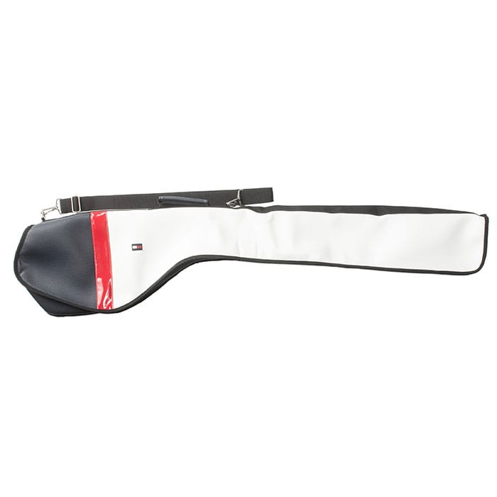 レザー調PU素材とエナメル生地を使用した高級感のあるモデル。 フード部分にアイアンヘッドが収まる窪みを設ける事でズレを抑え適正なバランスを維持。 上下にファスナーポケットを設け小物の収納整理。 収納性向上の為、開口部は広くとりケース上部、下部のマチを広げた設計。