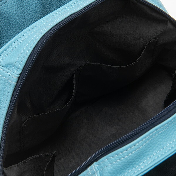 高級感のあるシボ合皮を多色使いで組み合わせたデザインが特徴。