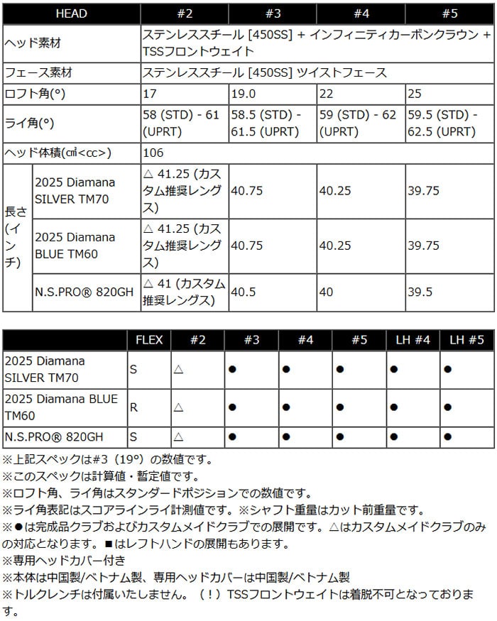 - 【ヘッド】 ステンレススチール [450SS] + インフィニティカーボンクラウン + TSSフロントウェイト 【シャフト】 2025 Diamana SILVER TM55 (S) 2025 Diamana BLUE TM50 (R) 【長さ】 #3:40.75インチ #4:40.25インチ #5:39.75インチ 【グリップ】 TM 2025 LK CL360 47.5g (径60/47.5g) 【アクセサリー】 Qi35 Original Head Cover
