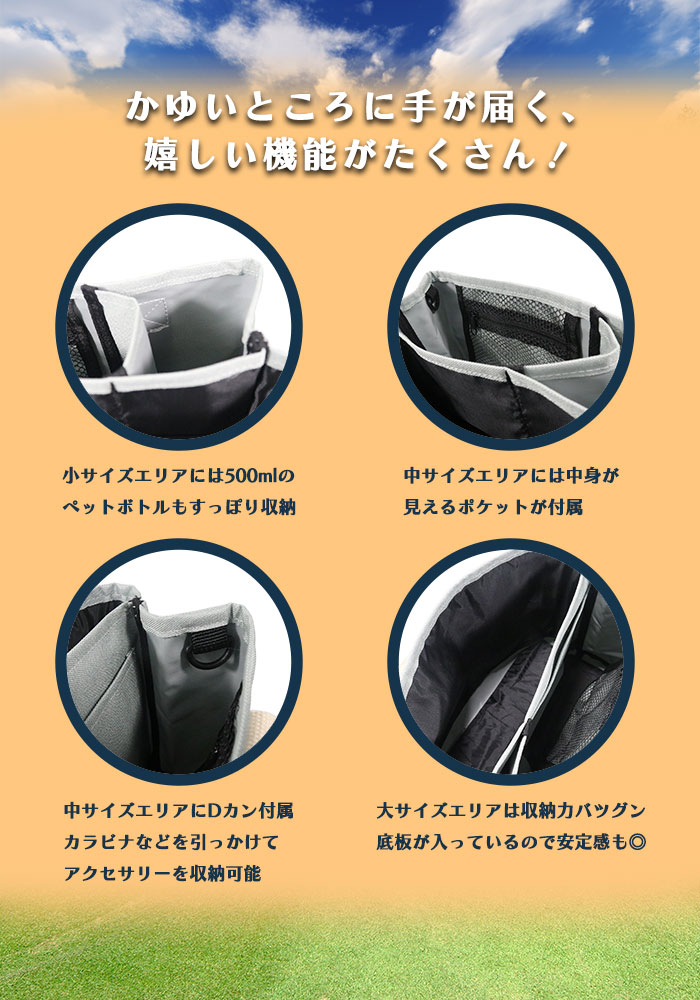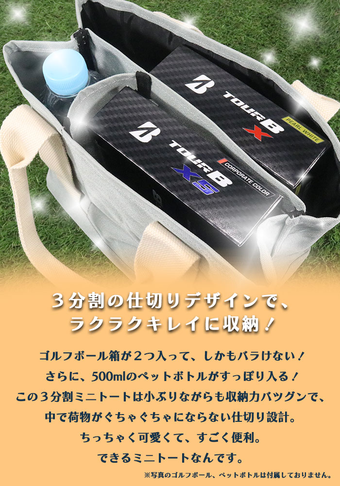 - 3分割の仕切りデザインで、ラクラクキレイに収納! ゴルフボール箱が2つ入って、しかもバラけない! さらに、500mlのペットボトルがすっぽり入る! この3分割ミニトートは小ぶりながらも収納力バツグンで、 中で荷物がぐちゃぐちゃにならない仕切り設計。 ちっちゃく可愛くて、すごく便利。 できるミニトートなんです。 【素材】ポリエステル 【サイズ】約H20cm×W24cm×D15cm 【ご注意】お客様都合(サイズが合わない、イメージが違う等)での返品及び交換はお受け出来ませんのでご了承下さい。