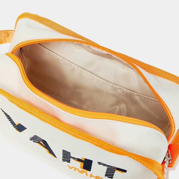 表側には小物を入れるようのファスナーポケットが付き、内側には