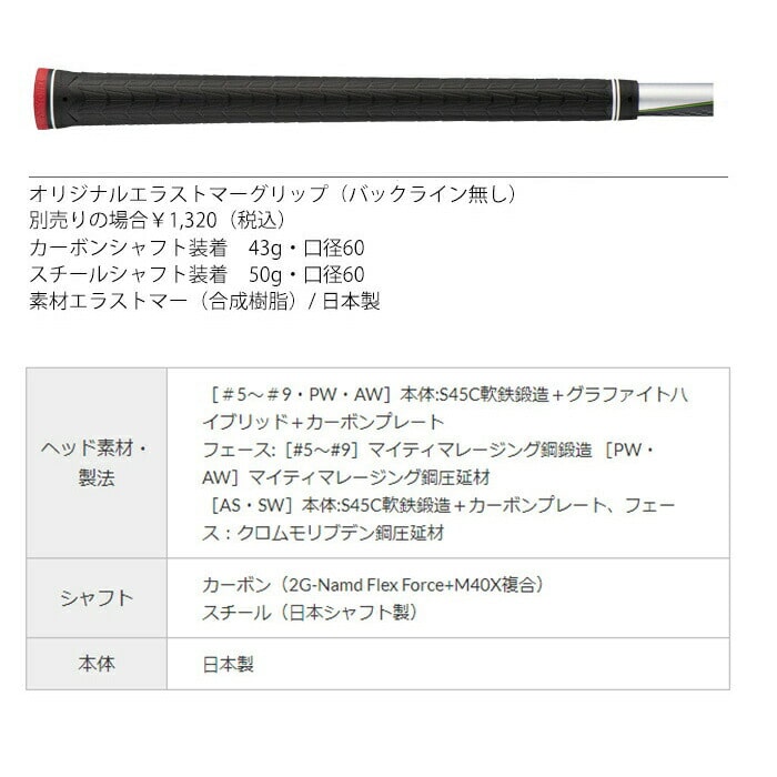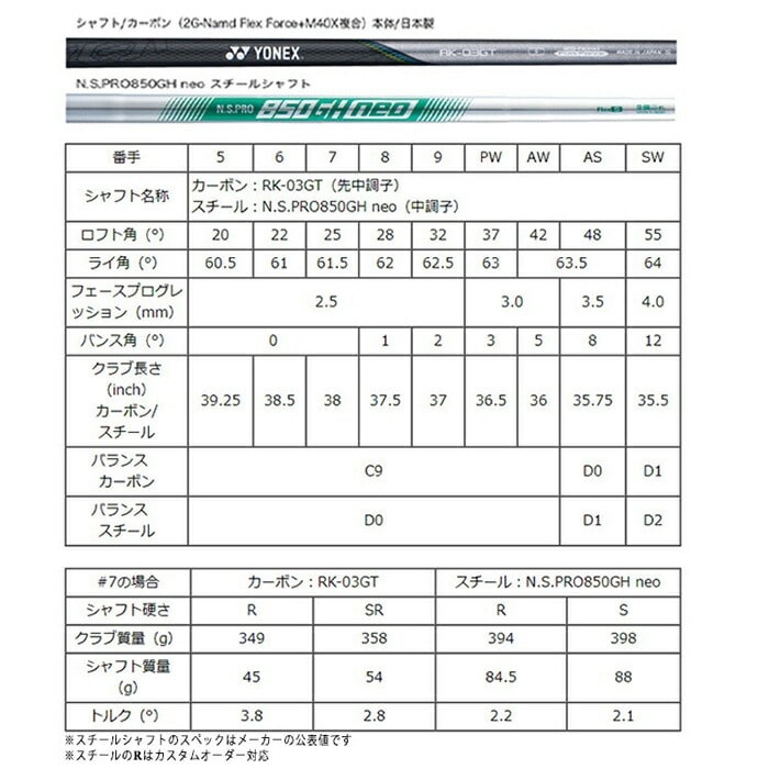 - 【商品説明】 低重心で高い弾道と好打感を実現し、極薄反発フェースで飛ばせるアイアン。 【番手】 7、8、9、PW 【ロフト角(°)】 [7]25 [8]28 [9]32 [PW]37 【ライ角(°)】 [7]61.5 [8]62 [9]62.5 [PW]63 【FP(mm)】 [7/8/9]2.5 [PW]3.0 【バンス角(°)】 [7]0 [8]1 [9]2 [PW]3 【クラブ長さ(inch)】 [RK-03GT/NS850 neo] [7]38 [8]37.5 [9]37 [PW]36.5 【バランス】 [RK-03GT]C9 [NS850 neo]D0 ※その他詳細スペックは商品画像をご確認ください。