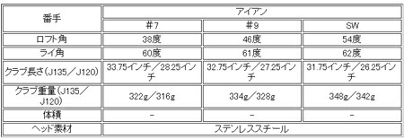 - 【商品特徴】 ○従来よりも1度フラットなライ角とラウンドソールで、身長に合った 正しいスウィングプレーンを身につけやすい新ライ角設計といたしました。 ○従来のラバーグリップの硬度を10%軟らかくしてグリップ力を向上。 非力なジュニアゴルファーでもしっかり振れて飛ばせます。 ○ジュニアのスウィングスピードを調査し、サイズによってシャフトフレックスを変更し、 振りやすさを向上させた「ジャストフレックス設計」を採用しています。 番手 アイアン #7 #9 SW ロフト角 38度 46度 54度 ライ角 60度 61度 62度 クラブ長さ(J135/J120) 33.75インチ/28.25インチ 32.75インチ/27.25インチ 31.75インチ/26.25インチ クラブ重量(J135/J120) 322g/316g 334g/328g 348g/342g 体積 - - - ヘッド素材 ステンレススチール