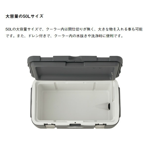 50Lの大容量サイズで、クーラー内は間仕切りが無く、大きな物を入れる事も可能です。また、ドレン付きで、クーラー内の水抜きや洗浄時に便利です。