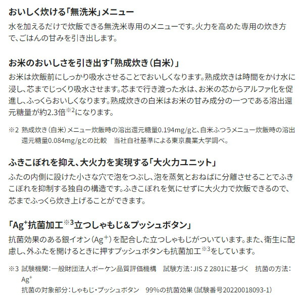 ※2 熟成炊き(白米)メニュー炊飯時の溶出還元糖量0.194mg/gと、白米ふつうメニュー炊飯時の溶出還元糖量0.084mg/gとの比較 当社自社基準による東京農業大学調べ。