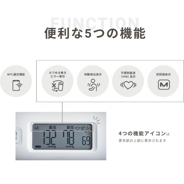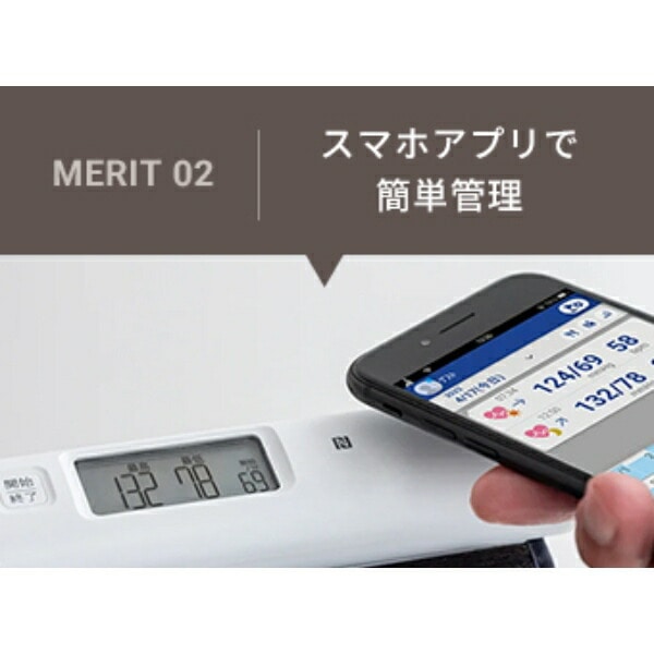 NFC内蔵の上腕式ホースレス血圧計。 ホースをなくし、本体とカフが一体となりました。