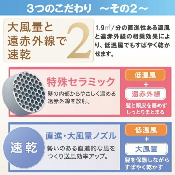 1.9m3/分の直進性ある温風と遠赤外線の相乗効果により低温風でもすばやく乾かせます。