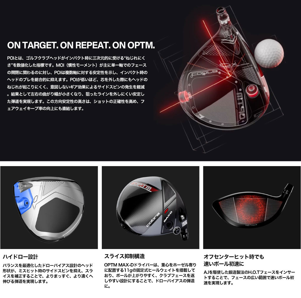 OPTM MAX-Dドライバーは、最大限のドローバイアス効果、スライス抑制、そして高い安定性を実現するよう設計されています。高度なスーパーコンピューティング解析によりウェイト配分を最適化することで、サイドスピンを軽減し、方向性の精度を高めます。