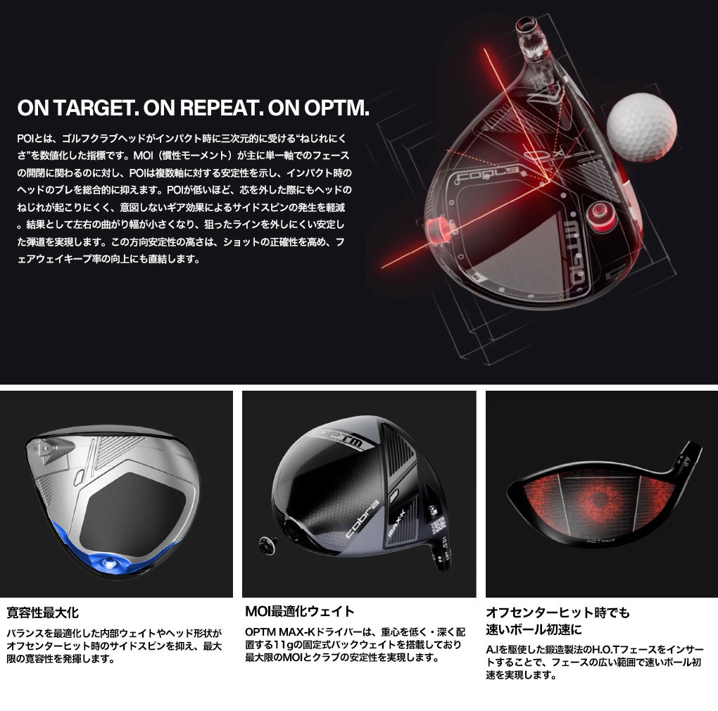 OPTM LSドライバーは、コンパクトな低スピン設計のヘッドで、最大限のスピードと高い精度を求めるプレーヤーのために開発されています。Cobraエンジニアは、MOI(慣性モーメント)を最適化しながら、可能な限り低いPOI(Product of Inertia)を実現することで、これまでで最も高い精度を誇るLSモデルを完成させました。その結果、低スピン性能に加えて、さらなる安定性を高め、左右のブレ幅を軽減しています。