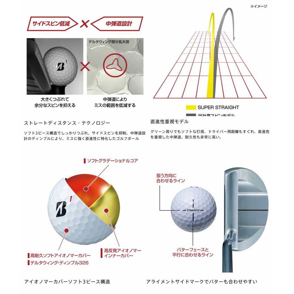 中弾道設計のディンプルにより、ミスに強く直進性に特化したゴルフボール。
