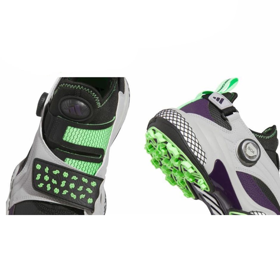 シルエットは通常モデルよりも高いカットが特徴的なトレーナースタイルとなっており、スポーティーでユニークなデザインを採用しています。防水性と安定性の高いテキスタイルアッパーを採用しつつ、直足BOAラップに加えてシューズの横と縦方向を360°ホールドする面ファスナーの外部ケージによってしっかりとした安定性を可能にしています。ケージのストラップがTWISTGRIPのデザインをあしらった面ファスナークロージャーになっており、最も膨張とブレが発生する前足部をしっかりと締め上げることでよりパワフルなスイングを可能にします。横方向から踵周りにかけても同様に、このケージがしっかりとサポートしていることで横方向への高い安定性をもたらします。コードカオス25 MID BOAは通常のBOAモデルより、更にしっかりとした安定性を求めるゴルファーにおすすめの一足です。