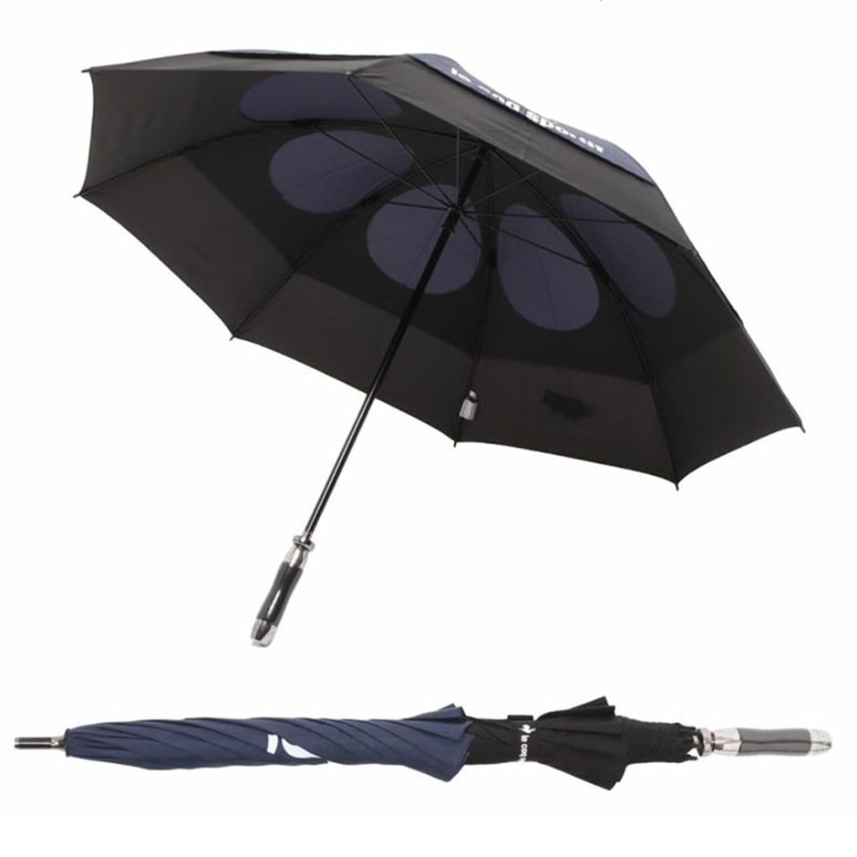生地の二層構造と風抜け穴仕様で、風や日差しが強い際にも対応できる傘"エアロストリームアンブレラ"です。ビッグサイズで二層構造にも関わらず、強くて軽く快適で、ゴルフプレー中にも適した傘になっています。UPF35で日傘としても使用可能です。 品番:QQBXJX06 素材:生地:ポリエステル100.0% シャフト:アルミニウム 骨:FRP ハンドル:EVA ABS樹脂 サイズ:F : 全長:93, 持ち手の長さ:14.5, 直径:113 重量:約400g カラー:ネイビー×ブラック(NVBK)