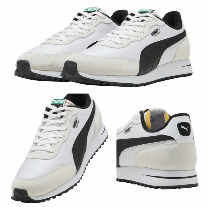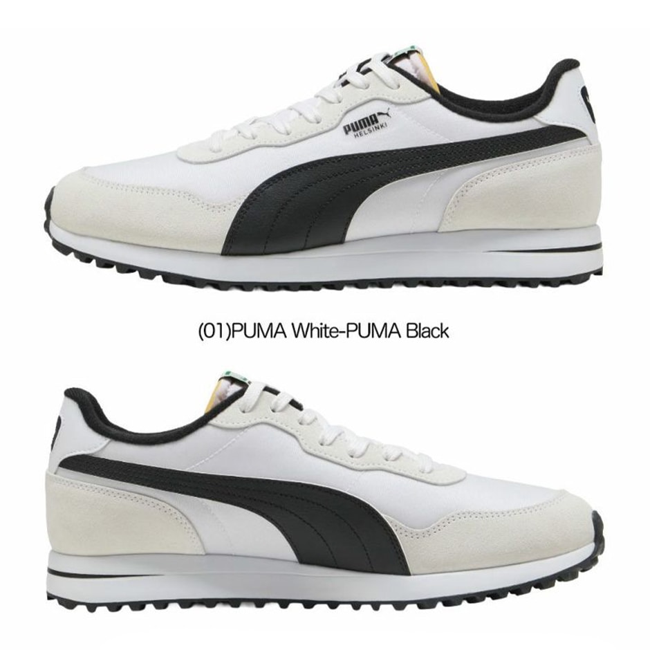 クラシックなデザインと、ゴルフに求められる最新の機能性を融合した「ヘルシンキ」ライン。 品番:312158 素材:ミッドソール/100% 合成繊維、中敷き/100% テキスタイル、アウトソール/ 100% ラバー、アッパー/ 54% 合成繊維, 44% 牛革, 2% テキスタイル、ライニング/100% テキスタイル サイズ:26?28cm タイプ:紐・スパイクレス カラー:(01)PUMA White-PUMA Black