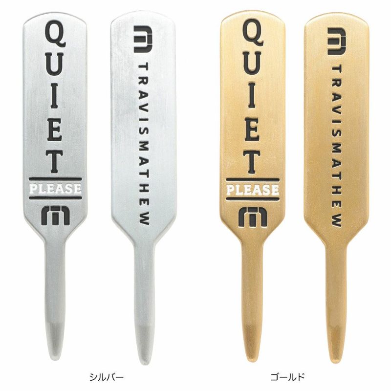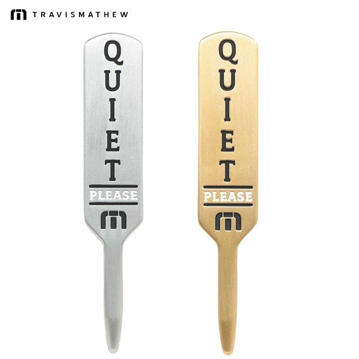 メタルボディで存在感のあるオリジナルマーカー。ツアーで見かけるQuietサインをモチーフにした遊び心あるデザインがポイントです。ラウンド時に欠かせないシングルのディボットツールとしても使用が可能。スタイリッシュで高級感もあるTRAVISMATHEWらしいおすすめのアイテムです。 品番:7AK906 サイズ:W15mm x H80mm x D4.5mm カラー:シルバー、ゴールド
