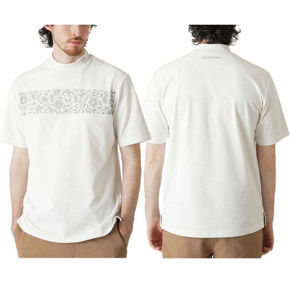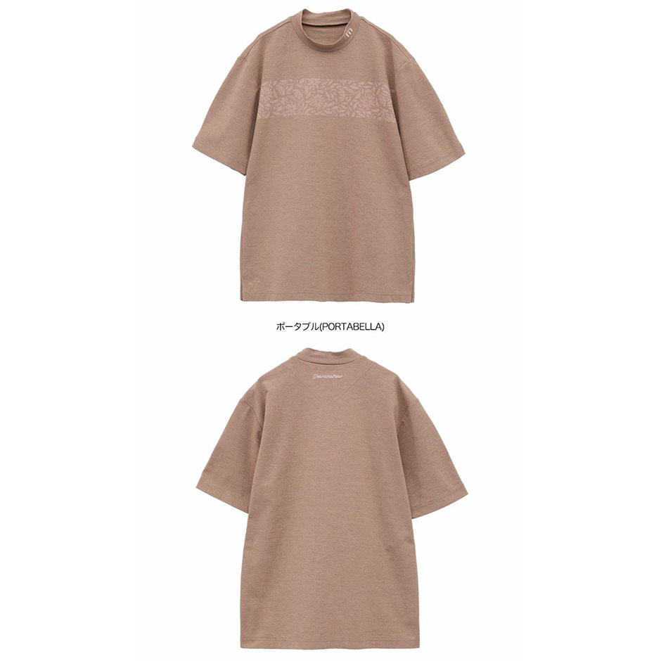 ソフトな肌触りで伸縮性に優れた鹿の子素材の半袖モックネックシャツ。2種類のポリエステルを使用し、色の濃淡によるメランジ効果が風合いを良く魅せるテキスタイル。チェスト部分にはシーズンモチーフのフローラルデザインをライン使いしたカジュアルなアクセントを加え、ネックラインのアイコンマークやバックネックのチェーン刺繍もさり気ないポイント。
