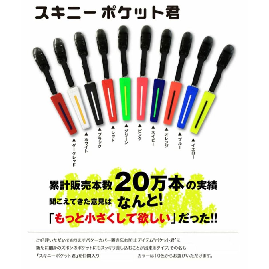 パターカバー置き忘れ防止アイテム“ポケット君”に新たに細身のズボンのポケットにもスッキリ差し込むことが出来るタイプ、その名も『スキニーポケット君』を仲間入り。 ●『スキニーポケット君』はプレー中腰にぶら下げて使えるので、パッティングの邪魔にならず、置き忘れの 心配もありません。 ●ラバー素材で出来ていますので、ラウンド中同伴者のクラブを傷付ける事はありません。 又、ラウンド後ヘッドカバーに付けたままキャディバッグに入れても安心です。 ● 色は10色よりお選びいただけます。 品番:LXPK-003 素材:ラバー カラー:ダークレッド、ホワイト、ブラック、レッド、グリーン、ピンク、ネイビー、オレンジ、ブルー、イエロー